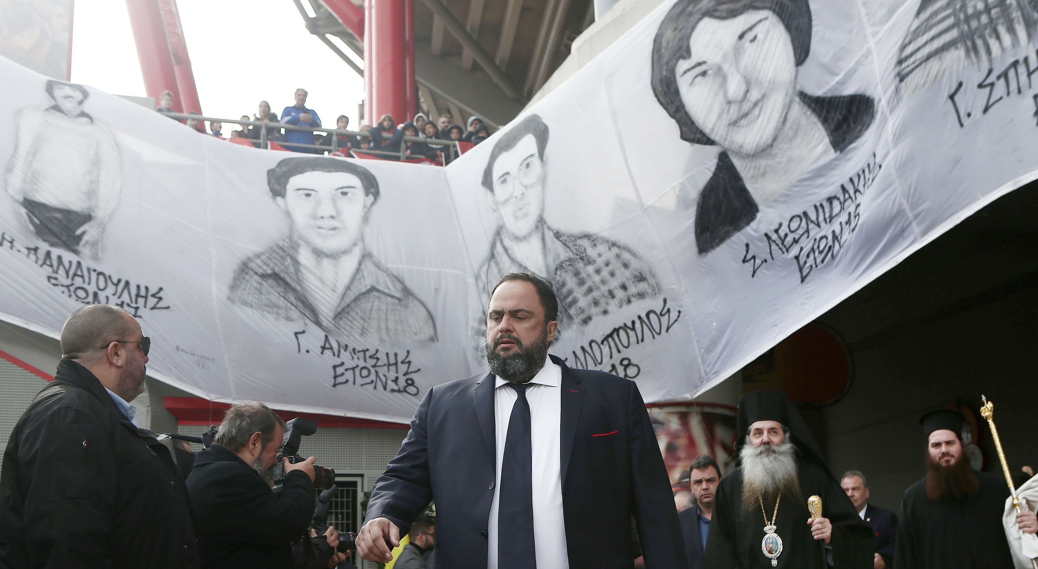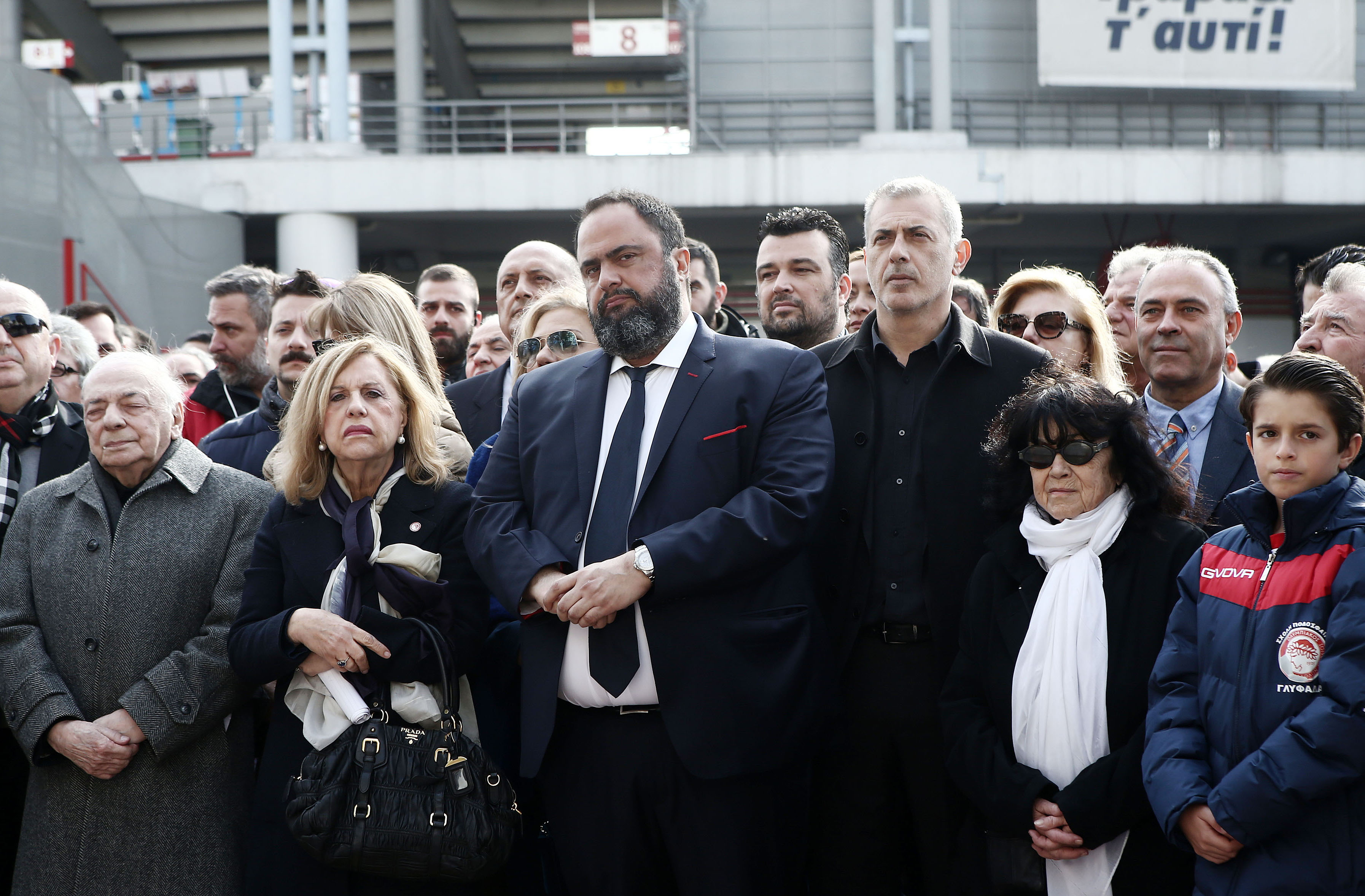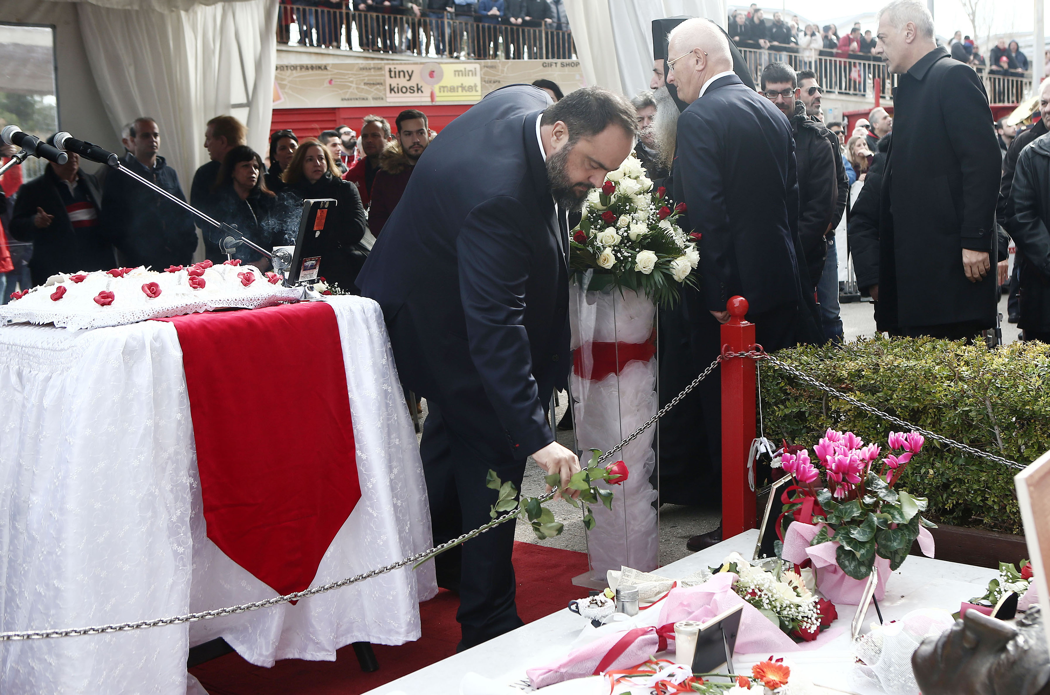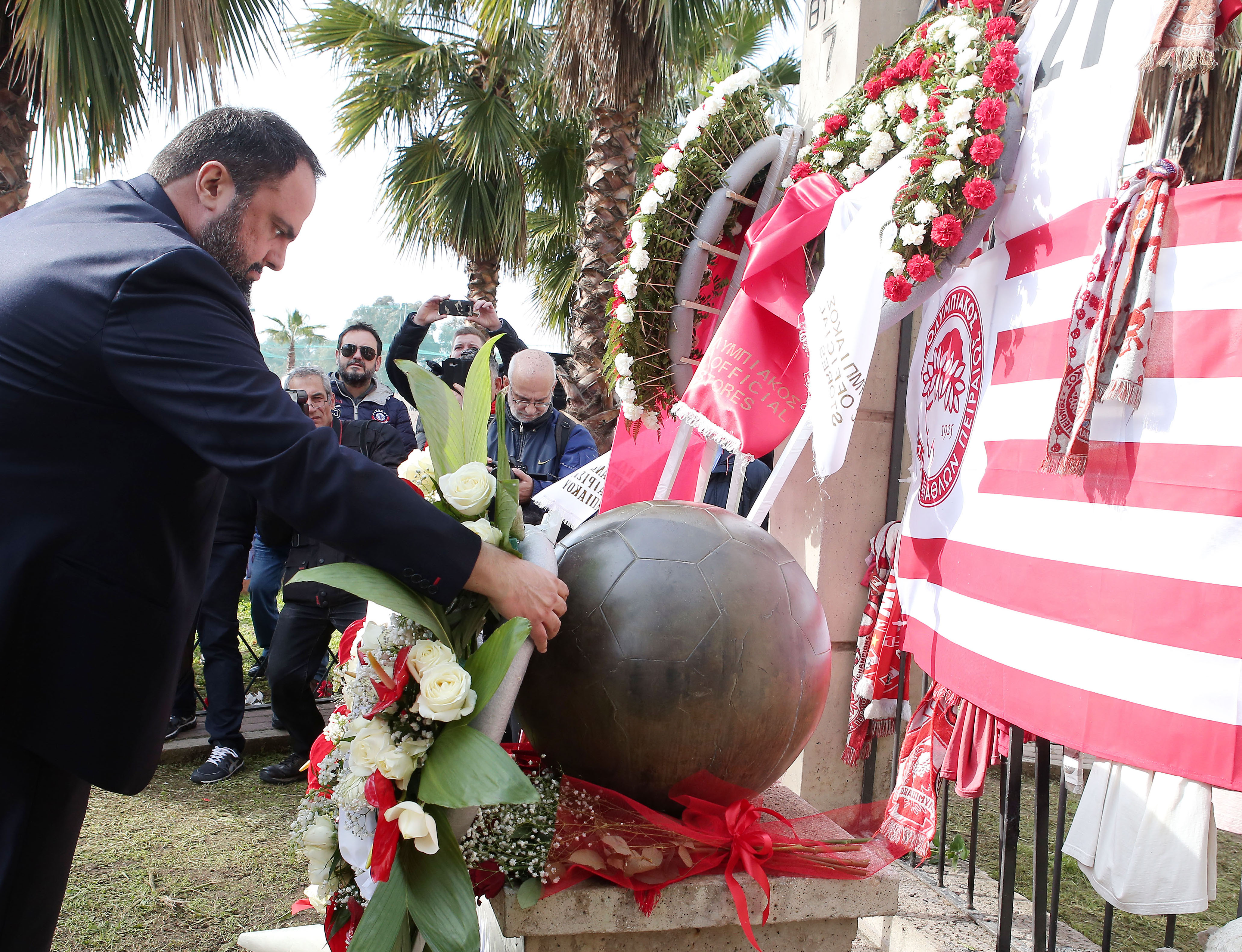 Μετά το πέρας της επιμνυμόσυνης δέησης, την οποία τέλεσε ο Μητροπολίτης Πειραιώς και Φαλήρου, Σεβασμιότατος κ.κ. Σεραφείμ, ακολούθησε η κατάθεση στεφάνων στο μνημείο του Δήμου Πειραιά, απέναντι από το γήπεδο Καραϊσκάκη. Ο ηγέτης του Ολυμπιακού, κ. Μαρινάκης, στάθηκε δίπλα στον Δήμαρχο Πειραιά, κ. Γιάννη Μώραλη και άκουσαν με προσοχή τον πύρινο λόγο του προέδρου της ΠΕΦΟ, κ. Κώστα Μπαρμπή, ο οποίος όπως πάντα, συγκίνησε.