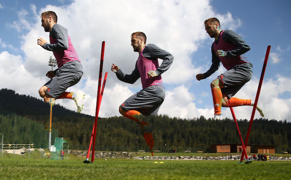 Το πρωινό πρόγραμμα είχε και πάλι πολλή μπάλα. Ασκήσεις σε κλειστό χώρο, άμυνα-επίθεση, με τους παίκτες χωρισμένους σε ομάδες και τη συμμετοχή τερματοφυλάκων, πάντα με ένταση και δίχως «χαλάρωση». Ακολούθησαν διτέρματα, σε μικρότερο χώρο πρώτα και μετά σε μεγαλύτερο. Οι «κλειστοί» χώροι βοηθούν ιδιαιτέρως στην καλή κυκλοφορία της μπάλας, ακόμη και σε συνθήκες μεγάλης πίεσης, αλλά στόχος δεν ήταν μόνο η καλή κατοχή, αλλά η επίτευξη γκολ.