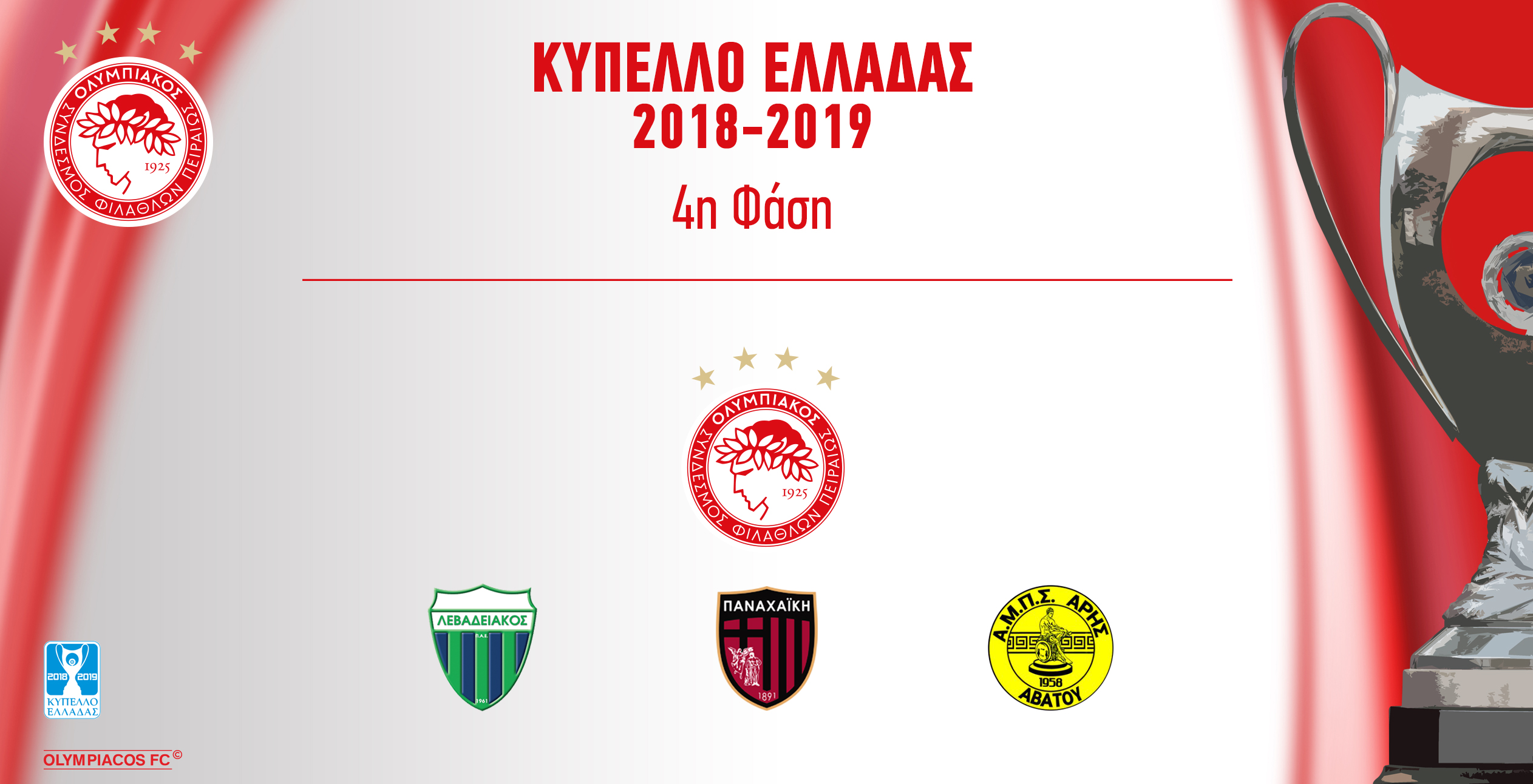 Πραγματοποιήθηκε πριν από λίγο η κλήρωση της 4ης φάσης του Κυπέλλου Ελλάδος, στην οποία συμμετέχει και ο Ολυμπιακός μας.