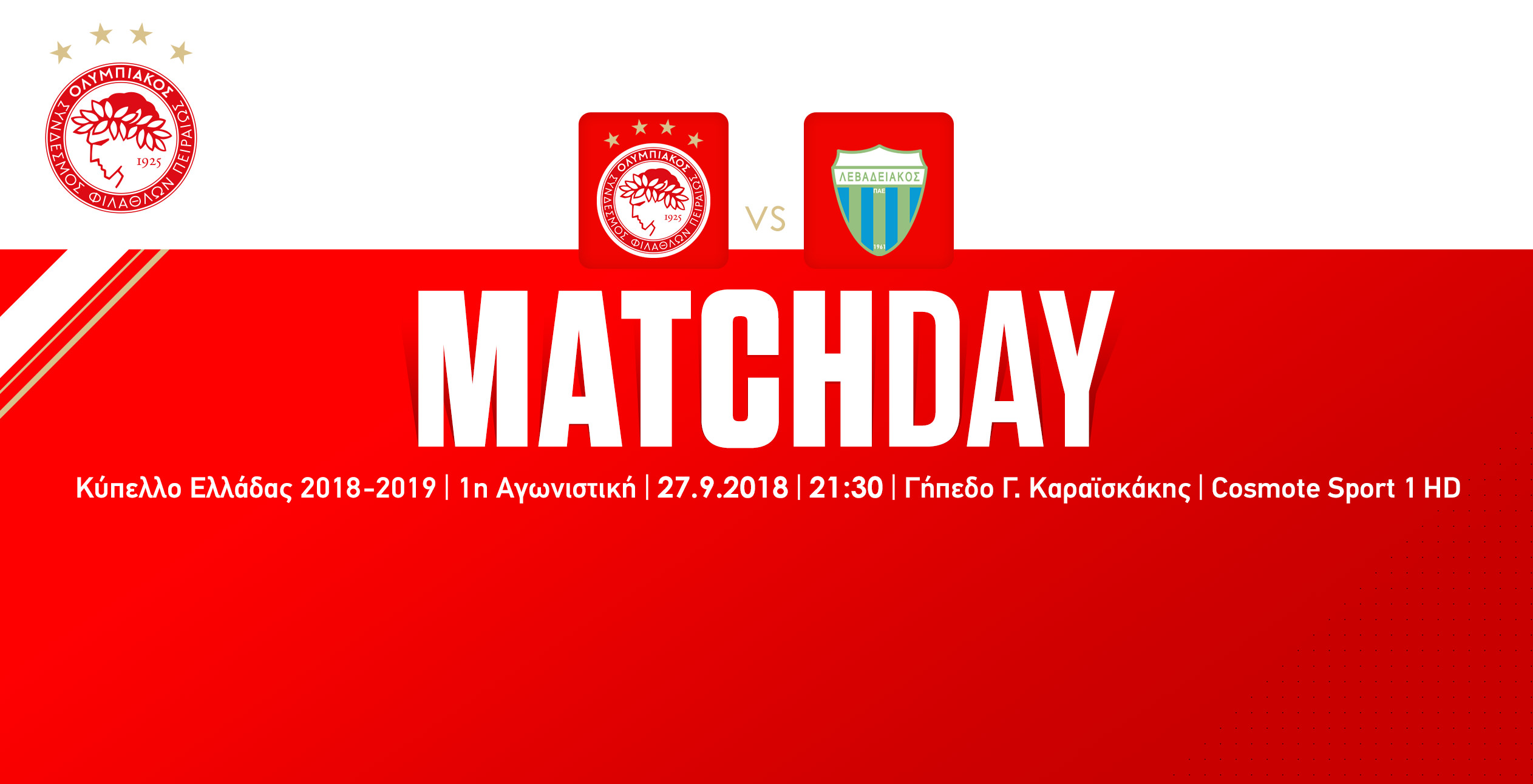Ο Ολυμπιακός ρίχνεται απόψε στη «μάχη» και του Κυπέλλου Ελλάδας, καθώς αντιμετωπίζει στο «Γ. Καραϊσκάκης» τον Λεβαδειακό (21:30-Cosmote Sport 1 HD), για την 1η αγωνιστική της 4ης φάσης της διοργάνωσης. Με φόντο την κατάκτηση του Κυπέλλου και κατ’ επέκταση του νταμπλ, ο Θρύλος θέλει να ξεκινήσει νικηφόρα στη διοργάνωση κόντρα στους Βοιωτούς.