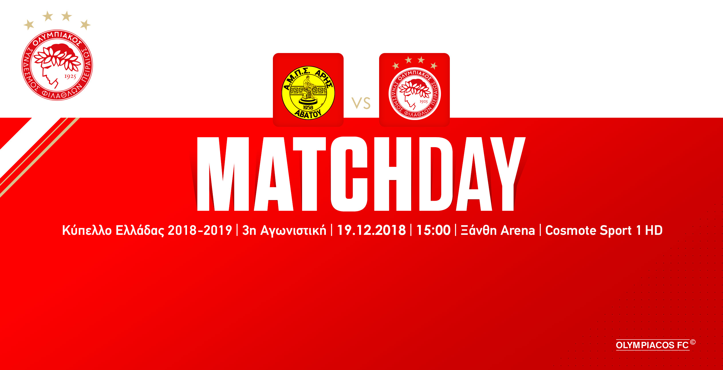Τον Άρη Αβάτου , στην «Ξάνθη Arena», αντιμετωπίζει ο Ολυμπιακός (15:00-Cosmote Sport 1 HD), στο πλαίσιο της 3ης και τελευταίας αγωνιστικής της 4ης φάσης του Κυπέλλου Ελλάδας. Ο Θρύλος μετά τις νίκες του κόντρα σε Λεβαδειακό και Παναχαϊκή, θέλει ακόμα μία για να πετύχει το απόλυτο, φτάνοντας παράλληλα τους 9 βαθμούς στον 5ο όμιλο.