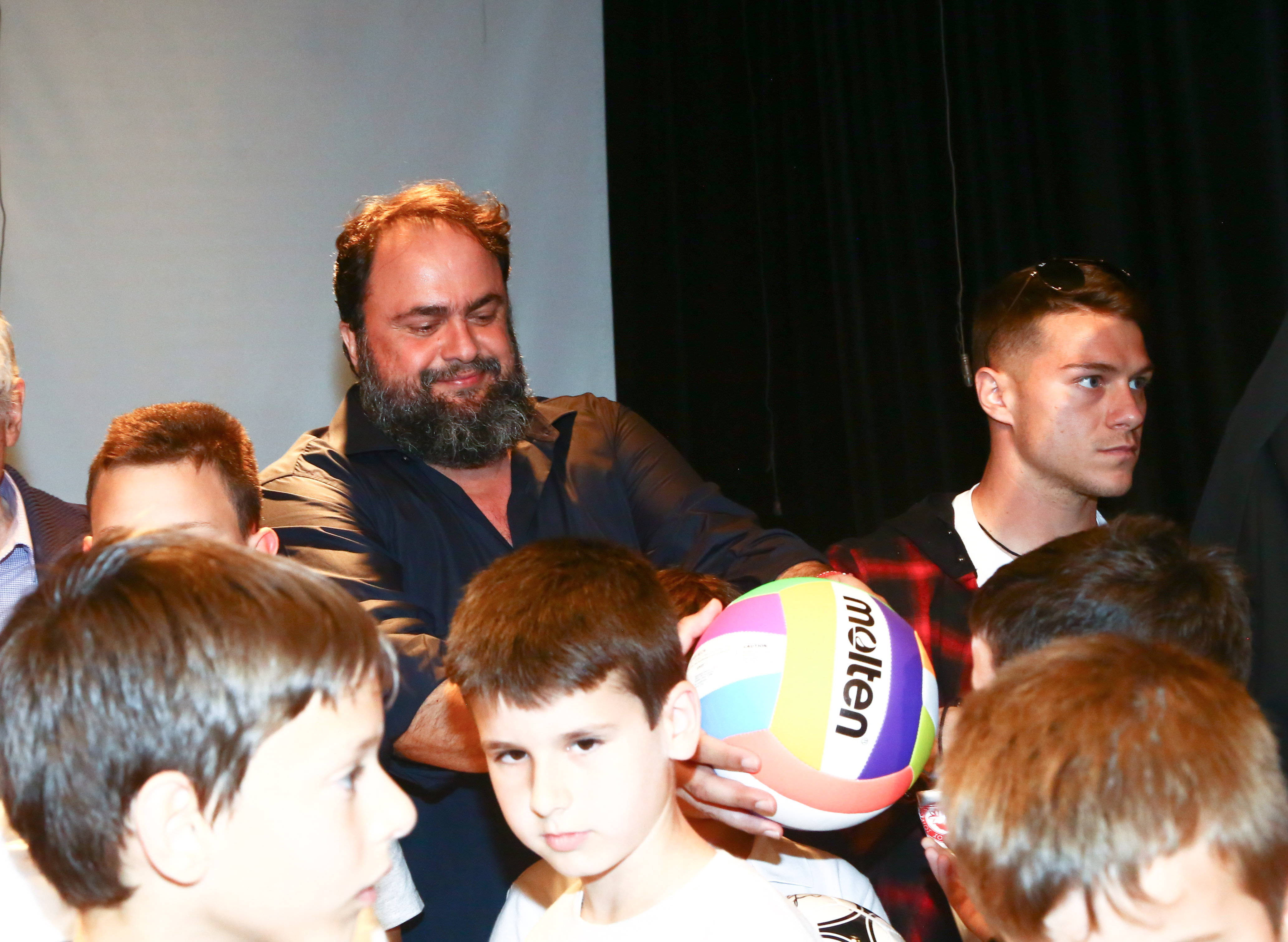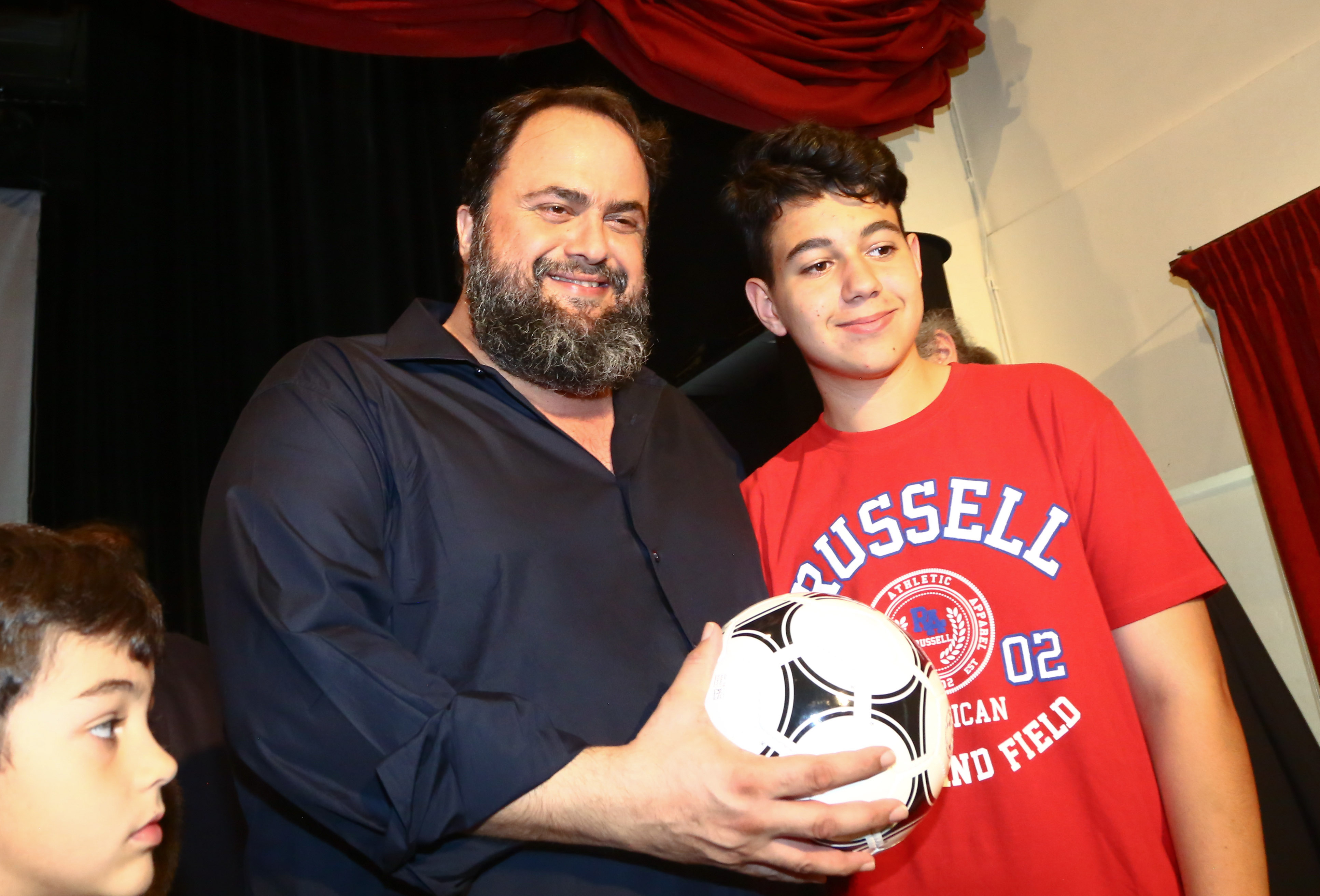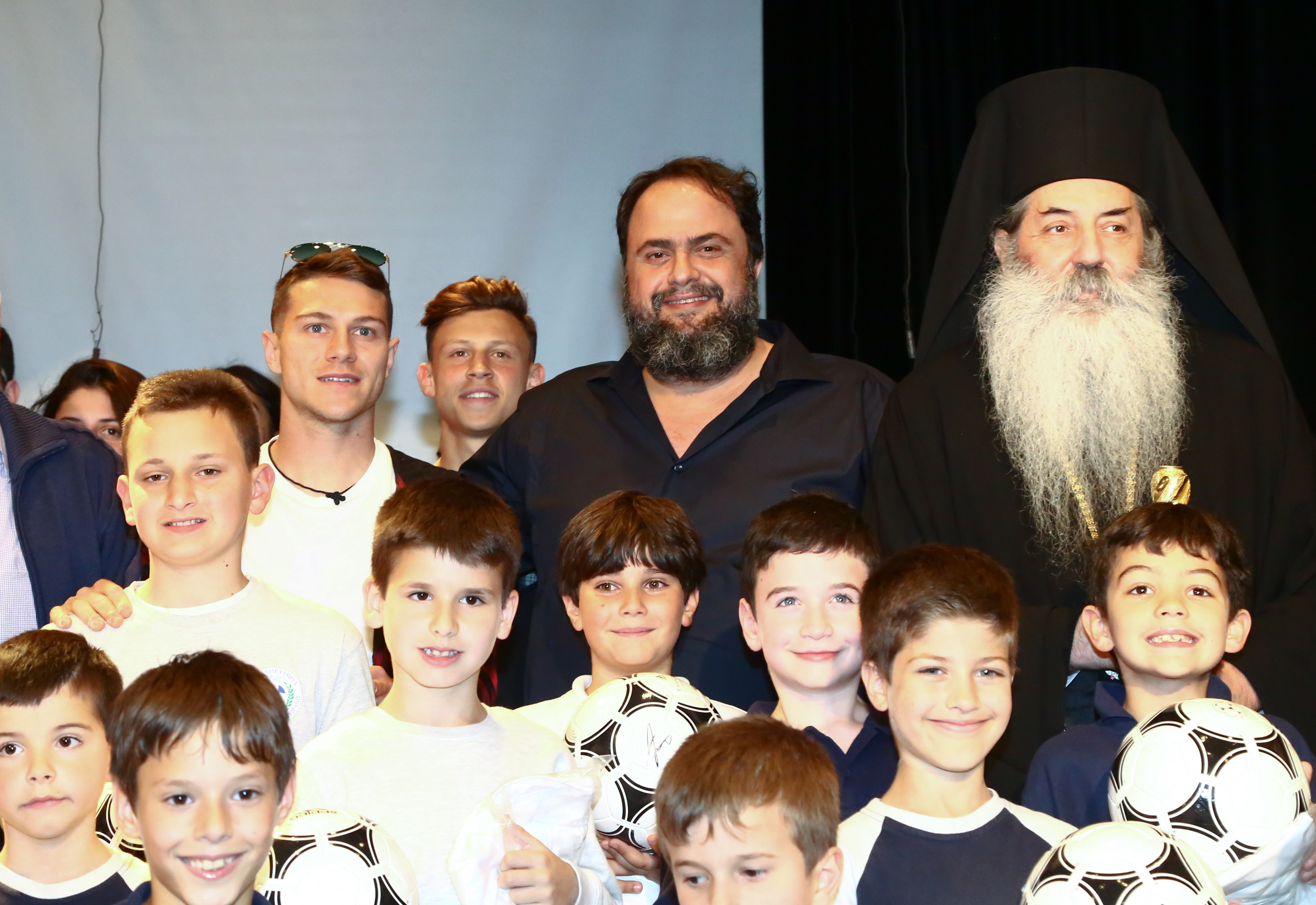 Ο κ. Μαρινάκης μετά το πέρας της ξενάγησής του στα εκπαιδευτήρια, μαζί με τον Λεονάρντο Κούτρη από το ποδοσφαιρικό τμήμα, τον κ. Σάββα Θεοδωρίδη, τον κ. Κούλη Δουρέκα και τον κ. Κώστα Καραπαπά, βρέθηκαν στο αμφιθέατρο των εκπαιδευτηρίων, εκεί όπου τους περίμεναν ο Σεβασμιότατος μαζί με τους καθηγητές και τους μαθητές του συγκροτήματος. Ο Σεβασμιότατος κ.κ. Σεραφείμ, έπλεξε το εγκώμιο του ηγέτη του Θρύλου, μιλώντας με συγκινητικά λόγια για εκείνον και τον ευχαρίστησε για την παρουσία του και την ενίσχυσή του στα εκπαιδευτήρια της Ιεράς Μητρόπολης, επίσης για το εκπαιδευτικό και κοινωνικό του έργο, καθώς και για τη διαχρονική του προσφορά στην κοινωνία.