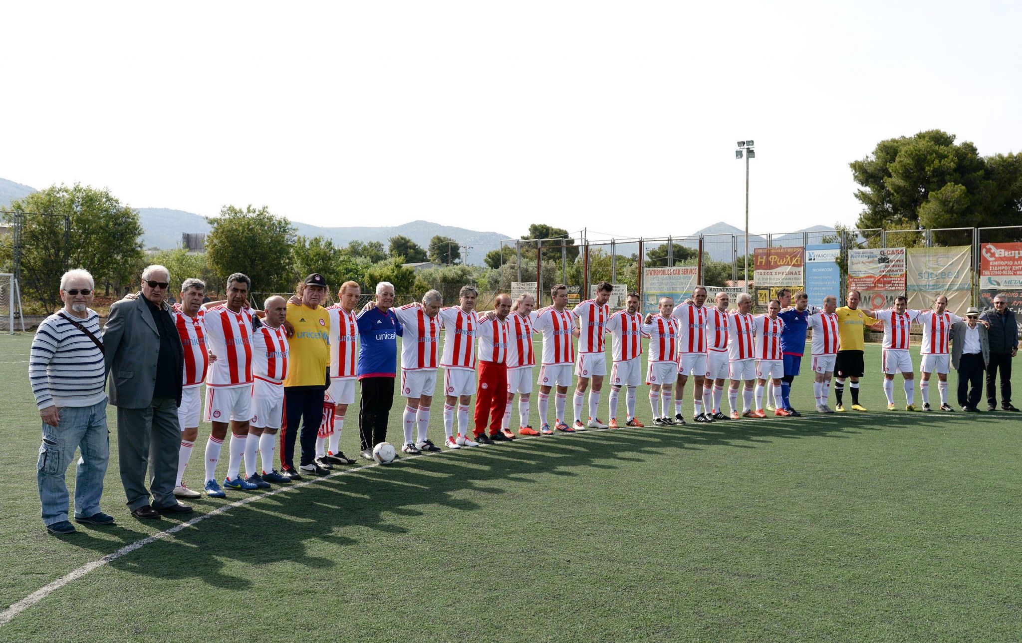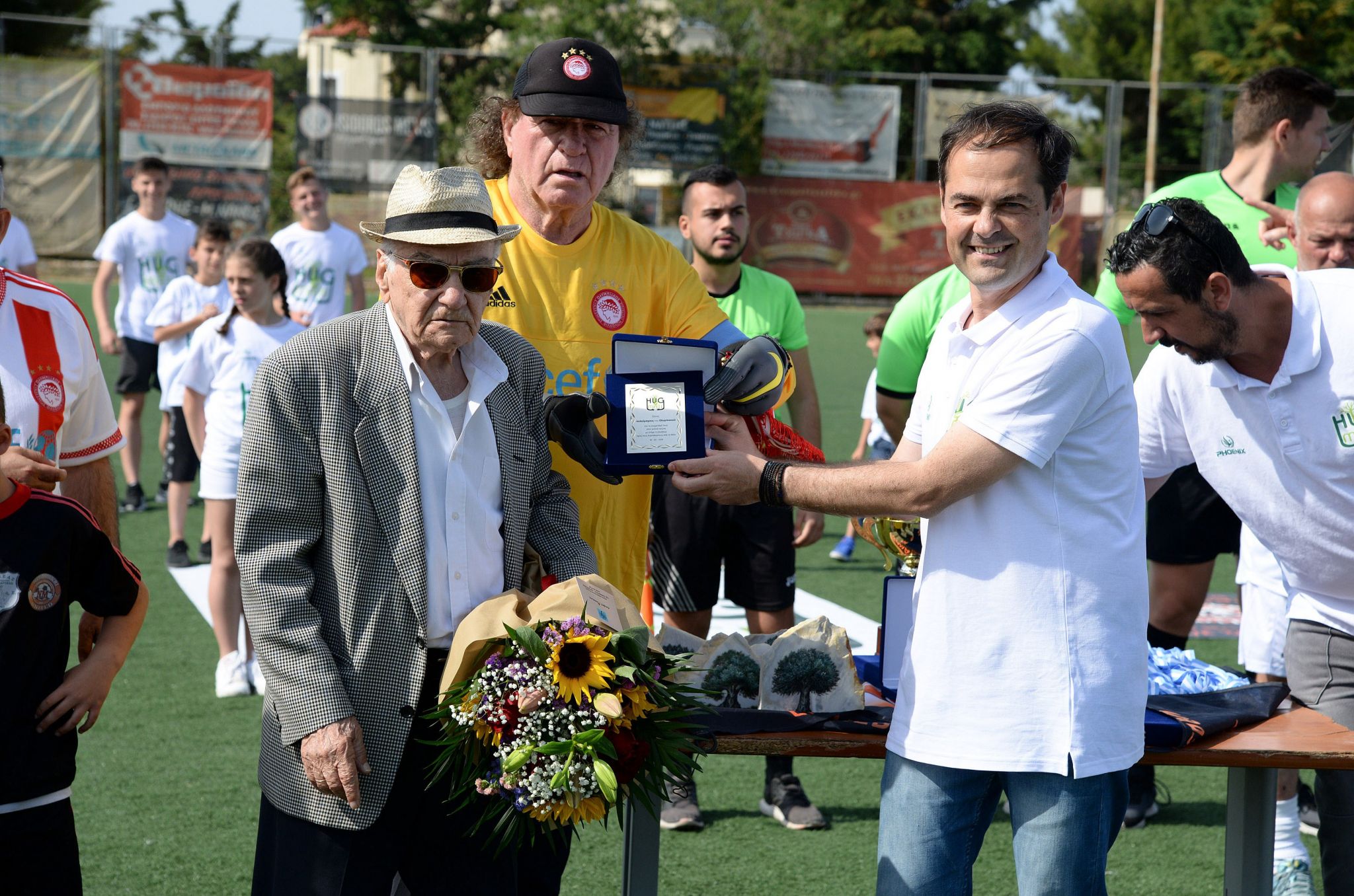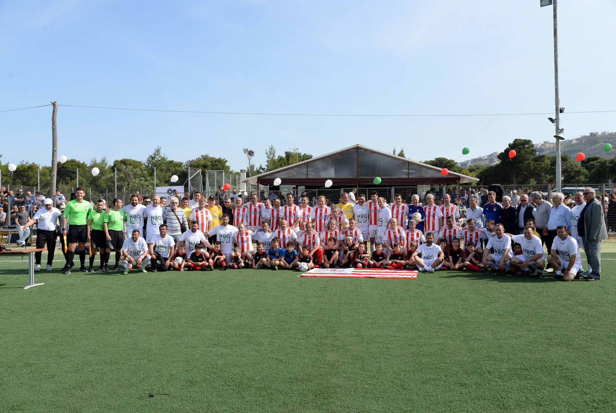Οι παλιές δόξες του Συλλόγου μας, αντιμετώπισαν την μικτή ομάδα καλλιτεχνών και παλαιμάχων του Δήμου Μαραθώνα, hug4mati. Η σπουδαία αυτή κίνηση από τον Σύνδεσμο Βετεράνων του Ολυμπιακού, δεν πέρασε απαρατήρητη από τους κατοίκους της περιοχής. Έτσι, πριν από την σέντρα του αγώνα, οι θρύλοι του Θρύλου βραβεύτηκαν από τους διοργανωτές και από ανθρώπους που έχουν συνεισφέρει στην περιοχή της Ανατολικής Αττικής.