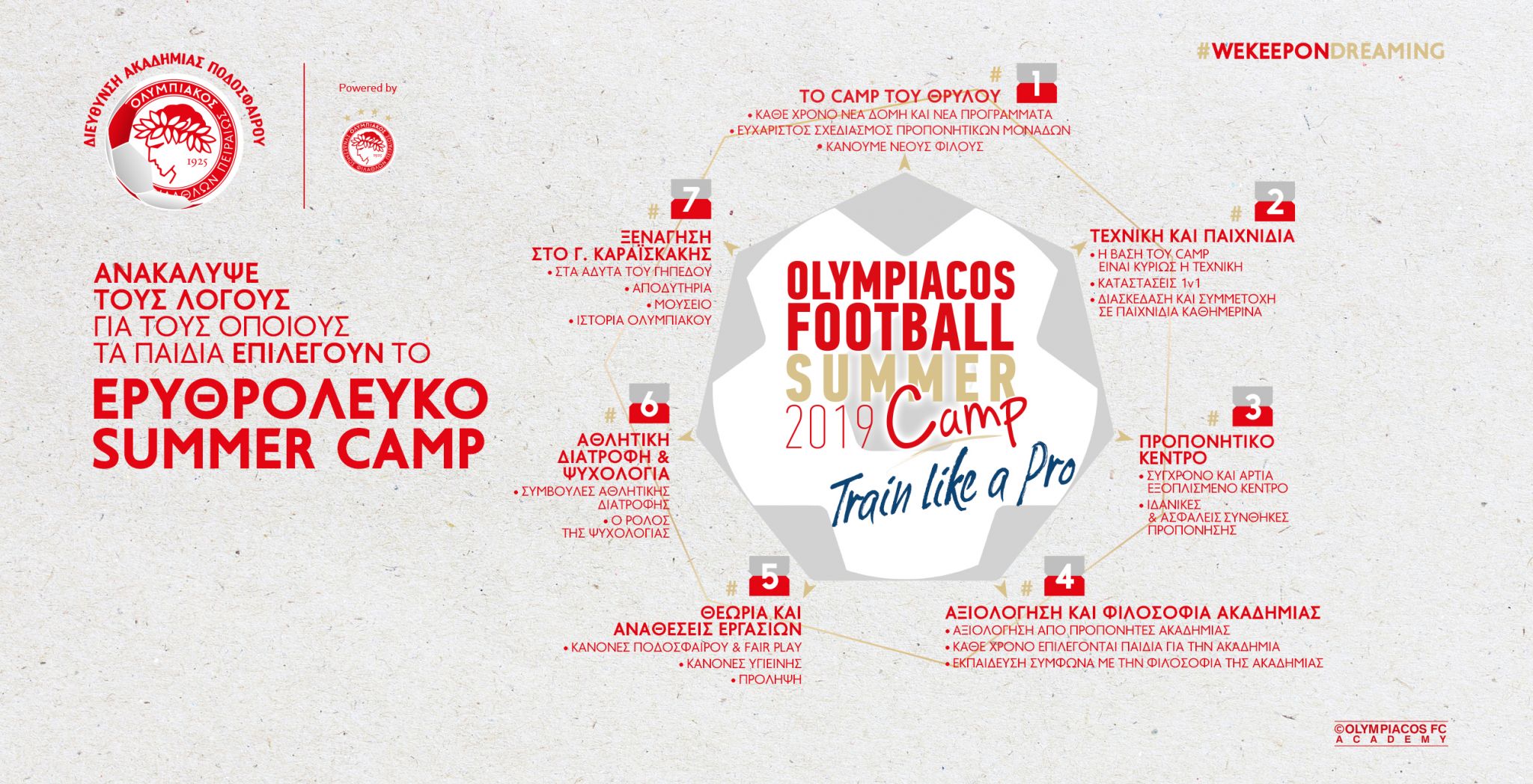 1) Το Camp του Ολυμπιακού παρουσιάζει ευχάριστη εκπαιδευτική δομή, με σκοπό να δίνει κίνητρο στα παιδιά.