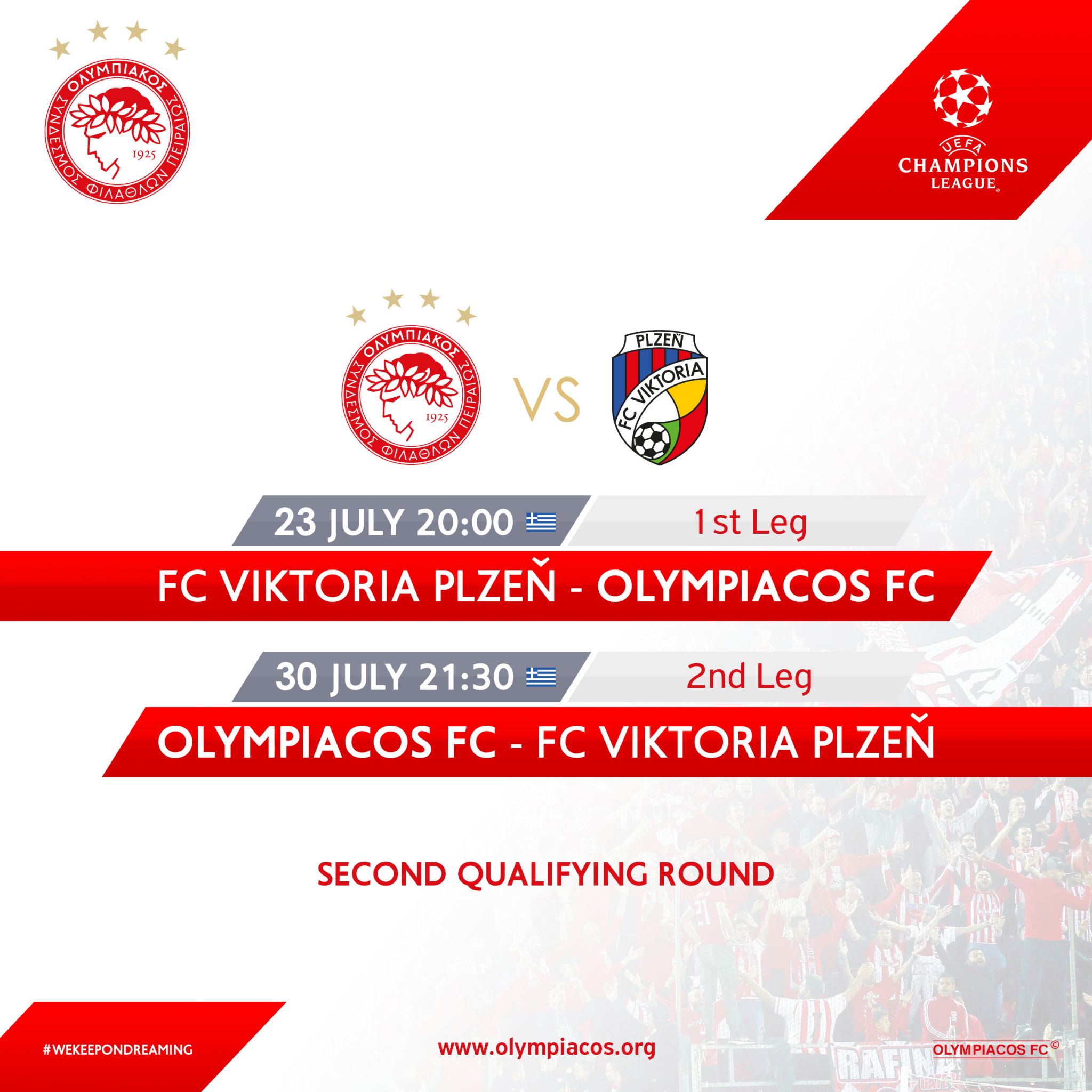 Οριστικοποιήθηκαν οι ημέρες και οι ώρες των αναμετρήσεων του ΟΛΥΜΠΙΑΚΟΥ με την Πλζεν για το Β’ Προκριματικό γύρο του Τσάμπιονς Λιγκ.
