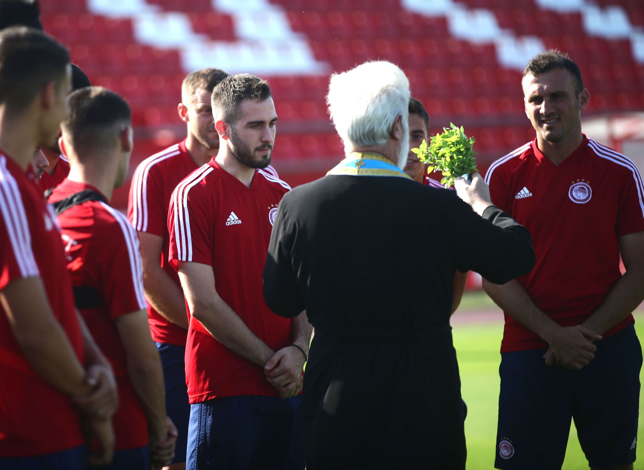 Ο αγιασμός τελέστηκε από τον πατέρα Δημήτριο παρουσία του ηγέτη του ΟΛΥΜΠΙΑΚΟΥ, Βαγγέλη Μαρινάκη, μελών της Διοίκησης και στελεχών της ΠΑΕ.