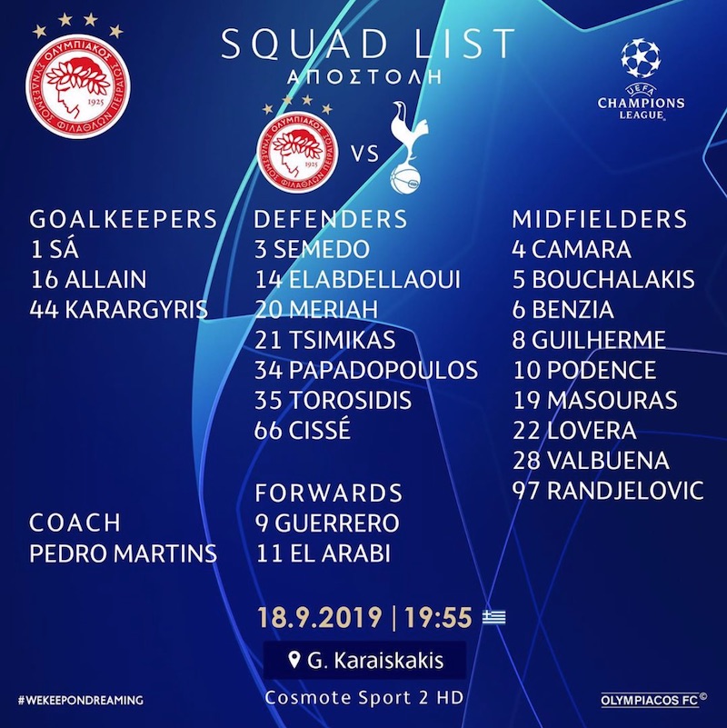 Με απογευματινή προπόνηση ολοκληρώθηκε την Τρίτη η προετοιμασία του ΟΛΥΜΠΙΑΚΟΥ για το παιχνίδι με την Τότεναμ. Ο κ. Πέδρο Μαρτίνς αμέσως μετά ανακοίνωσε τα ονόματα που απαρτίζουν την αποστολή για την πρεμιέρα των ομίλων του UEFA Champions League.