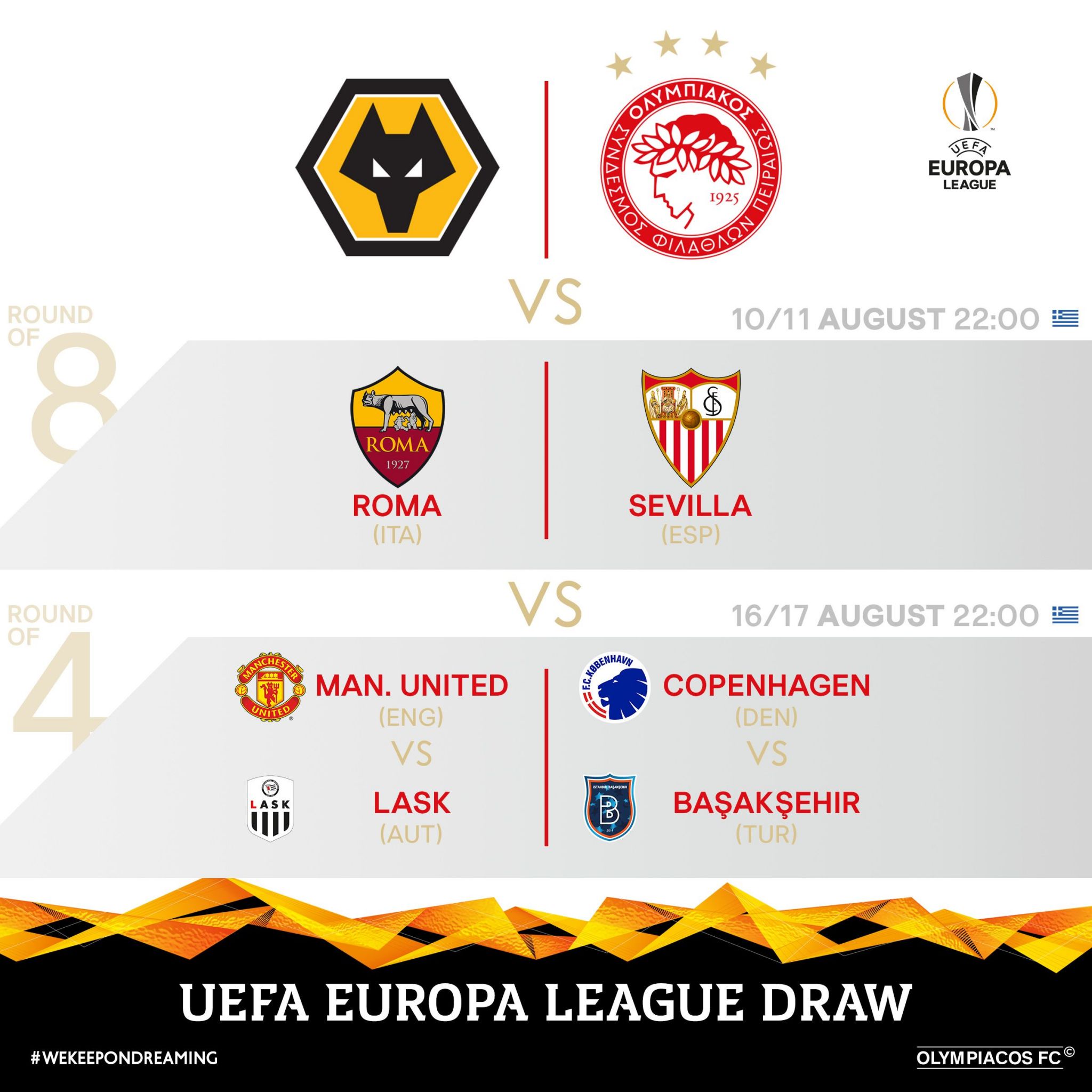 Σε περίπτωση πρόκρισης επί της Γουλβς (5/8 ή 6/8 το δεύτερο παιχνίδι), ο Ολυμπιακός θα αντιμετωπίσει κατά σειρά και σε μονά παιχνίδια, τον νικητή του ζευγαριού Ρόμα-Σεβίλη (προημιτελικά) και στη συνέχεια την ομάδα που θα προκύψει από τα Μάντσεστερ Γιουνάιτεντ-ΛΑΣΚ Λιντς – Κοπεγχάγη-Μπασάκσεχιρ (ημιτελικά).