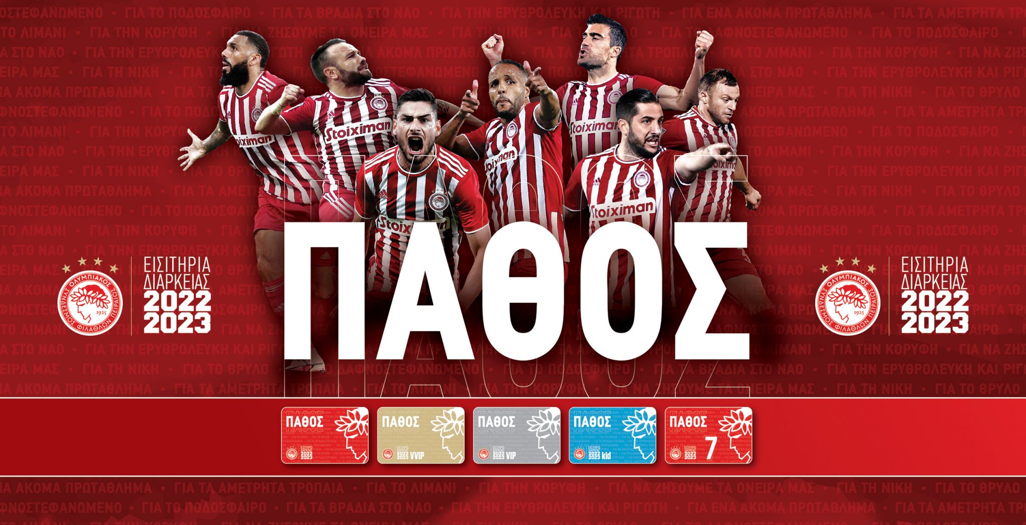 Η ΠΑΕ Ολυμπιακός με το σύνθημα «Πάθος» παρουσίασε την Τετάρτη 8 Ιουνίου τα εισιτήρια διαρκείας της αγωνιστικής περιόδου 2022-23, η διάθεση των οποίων αρχίζει την Πέμπτη 9 Ιουνίου.