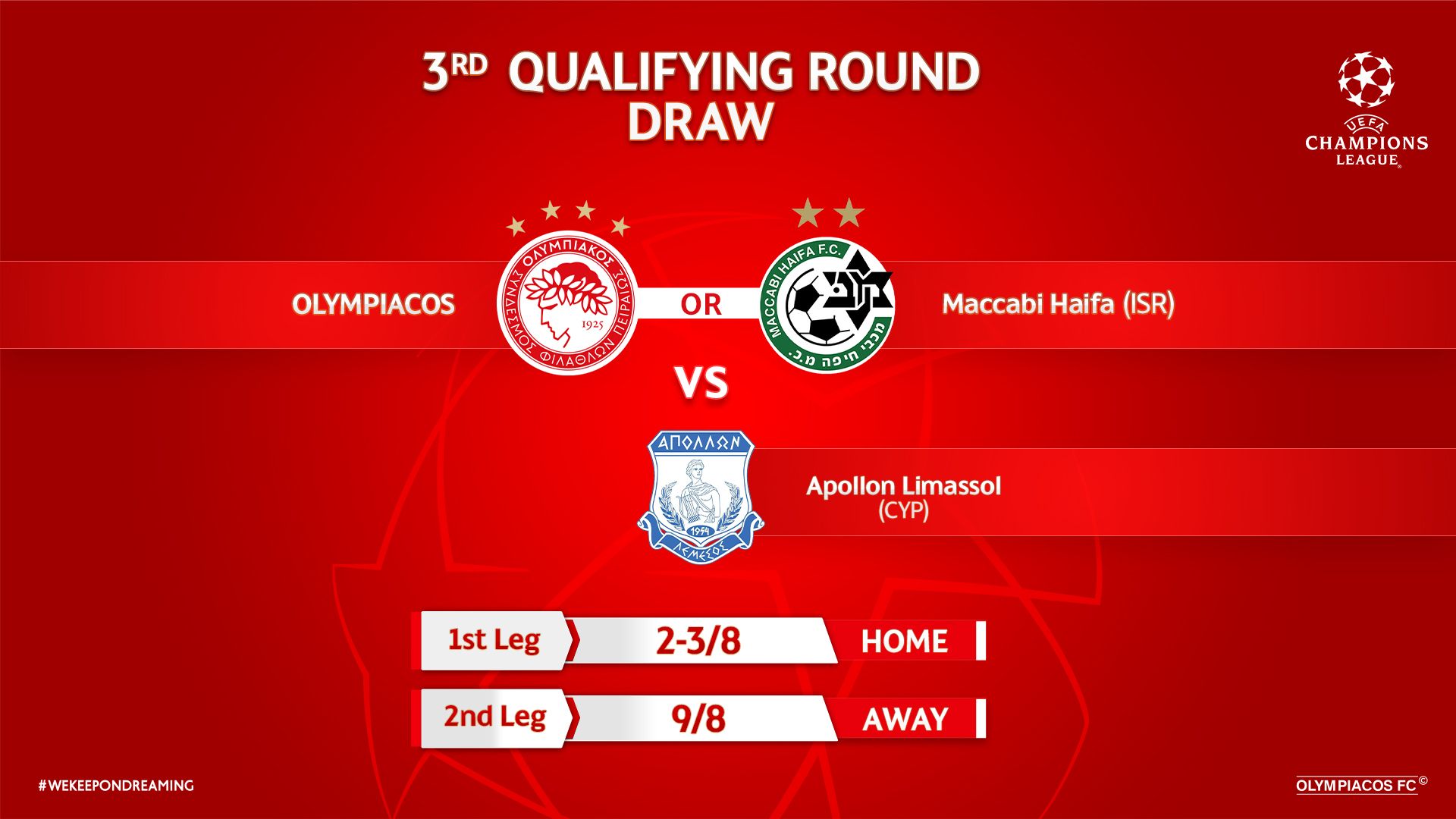 Τον Απόλλωνα Λεμεσού θα αντιμετωπίσει ο Ολυμπιακός στον τρίτο προκριματικό γύρο του UEFA Champions League, σε περίπτωση πρόκρισης εναντίον της Maccabi Haifa (20/7 – 27/7).