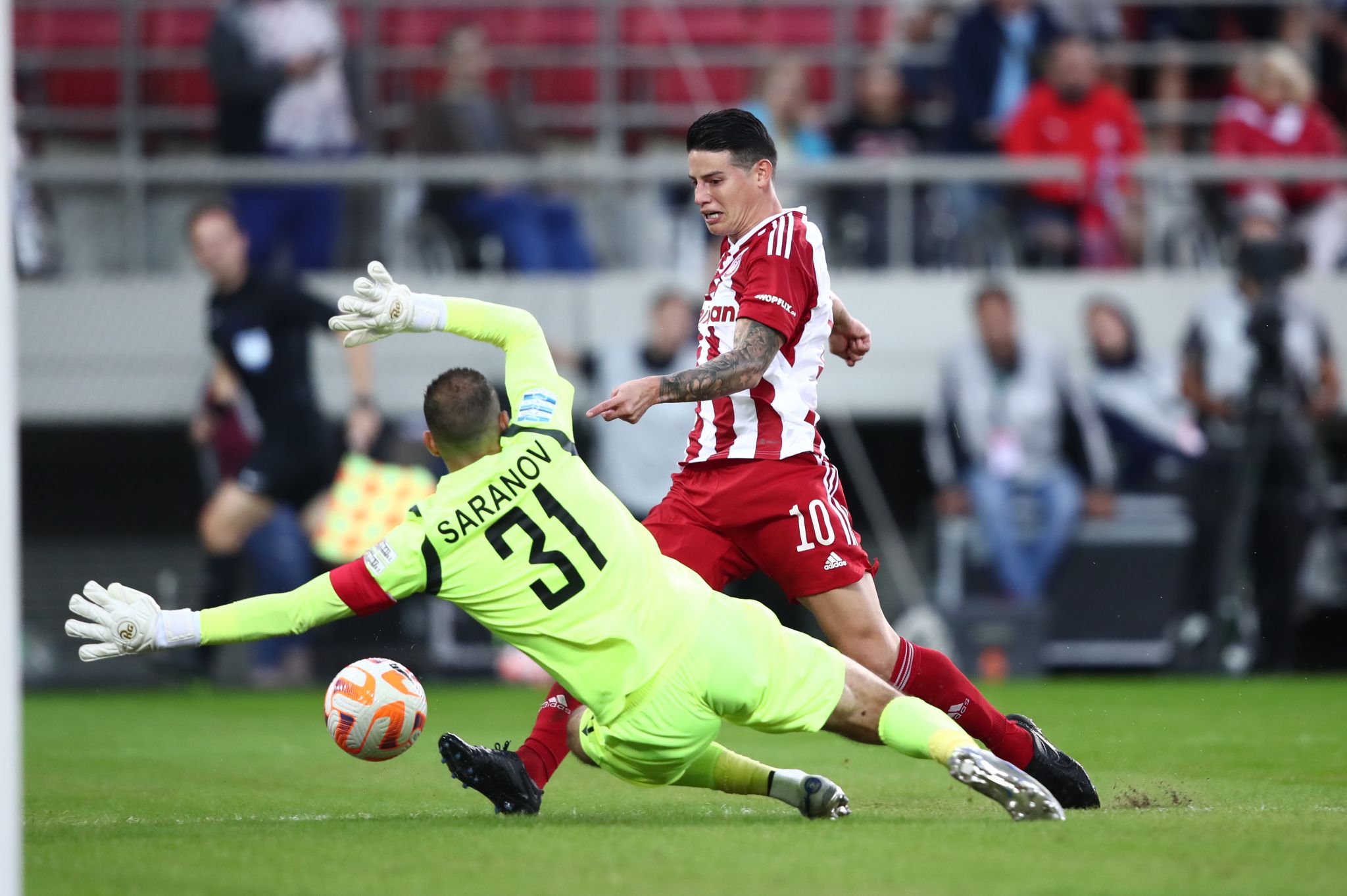 Δε σταμάτησε ο Ολυμπιακός να ψάχνει και άλλο γκολ και στο 43′ ο Μπιέλ σούταρε από πλάγια θέση με τον Σαράνοφ να διώχνει σε κόρνερ.