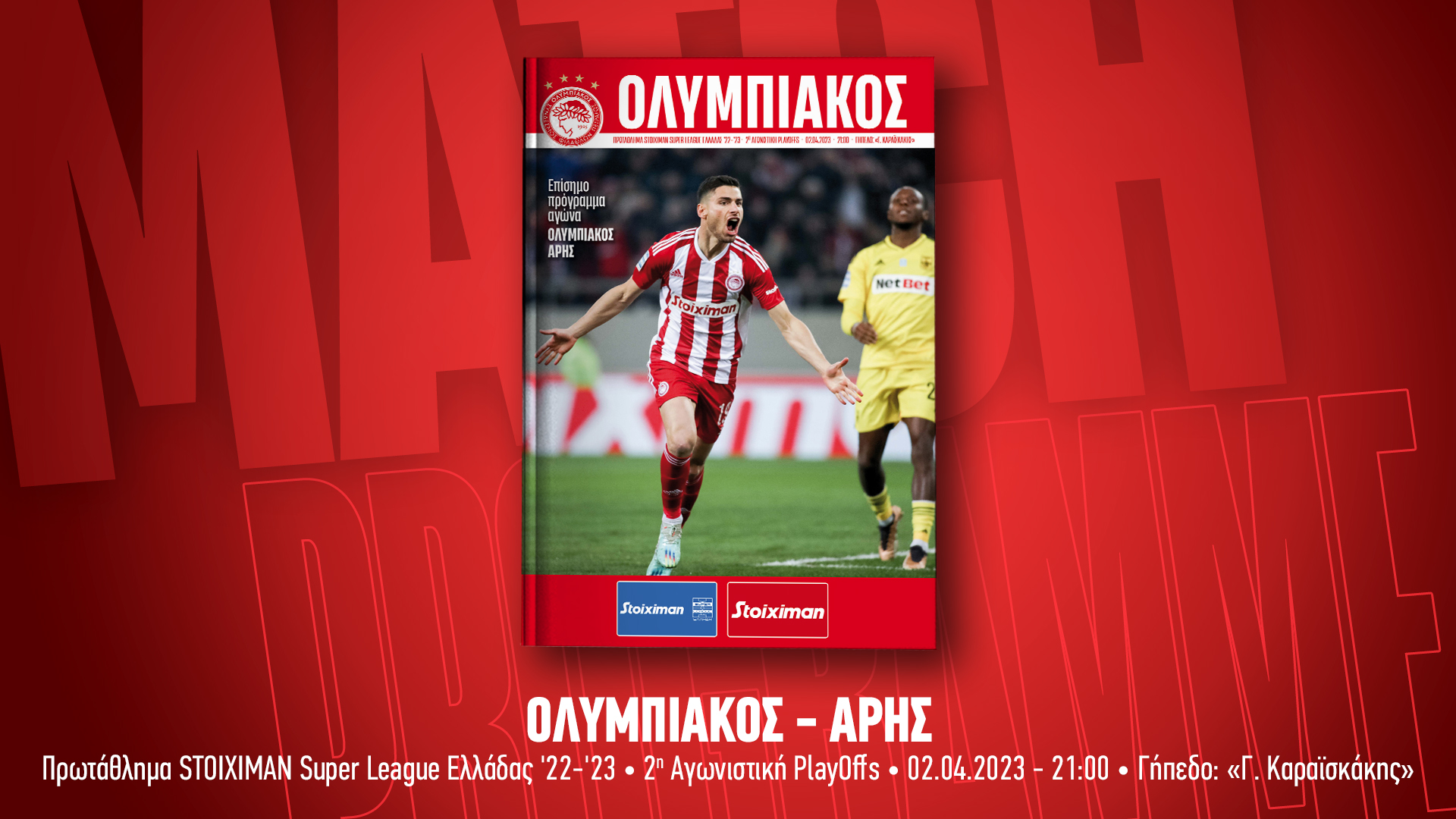 Το match programme της αναμέτρησης Ολυμπιακός - Άρης, για τη 2η αγωνιστική των Playoffs του πρωταθλήματος της Stoiximan Super League.