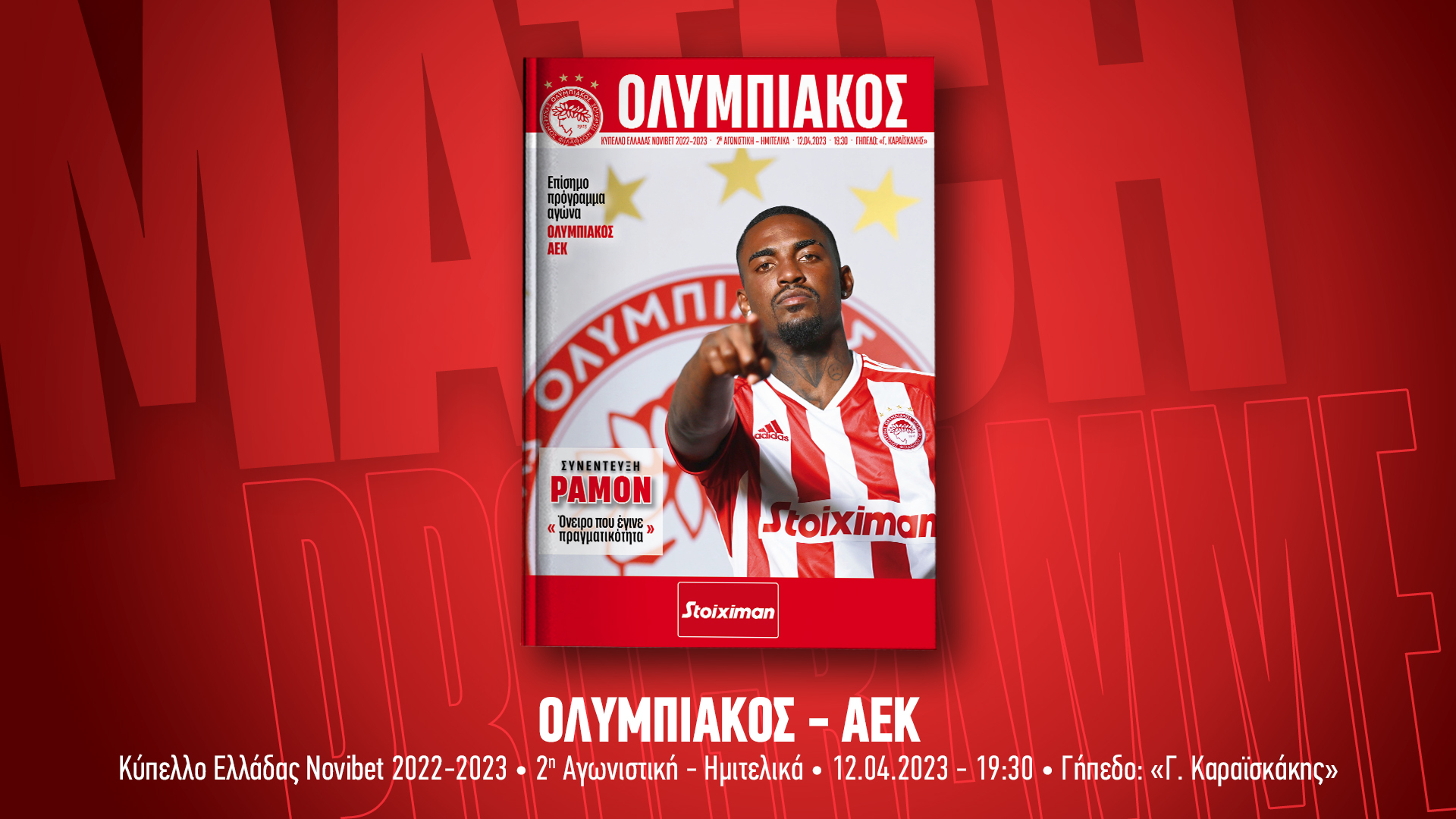 Το match programme της αναμέτρησης Ολυμπιακός – ΑΕΚ, στο πλαίσιο του δεύτερου αγώνα της ημιτελικής φάσης του Κυπέλλου Ελλάδας NOVIBET 2022/23.