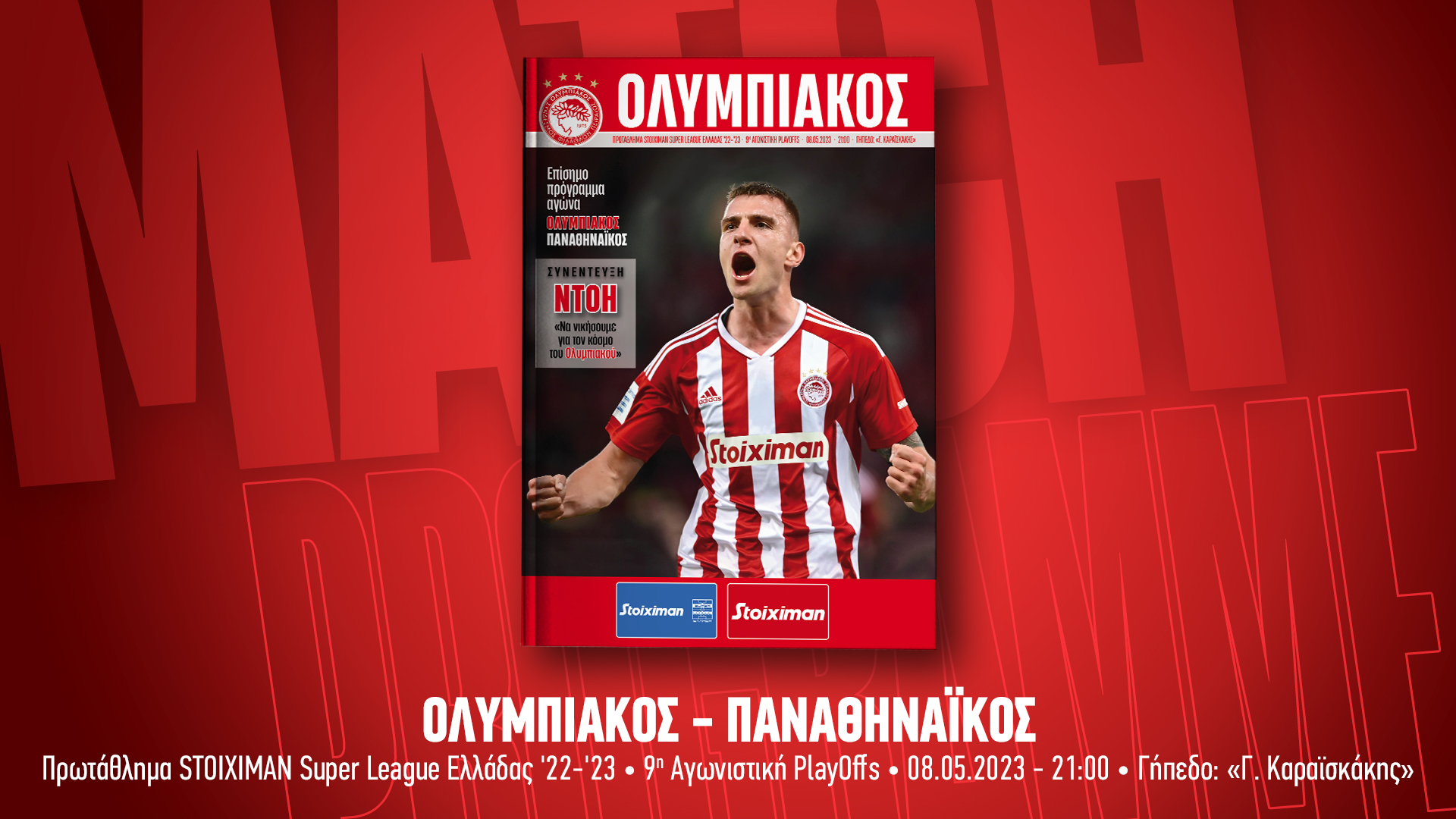 Το match programme της αναμέτρησης Ολυμπιακός – Παναθηναϊκός, για την 9η αγωνιστική των Playoffs του πρωταθλήματος της Stoiximan Super League.