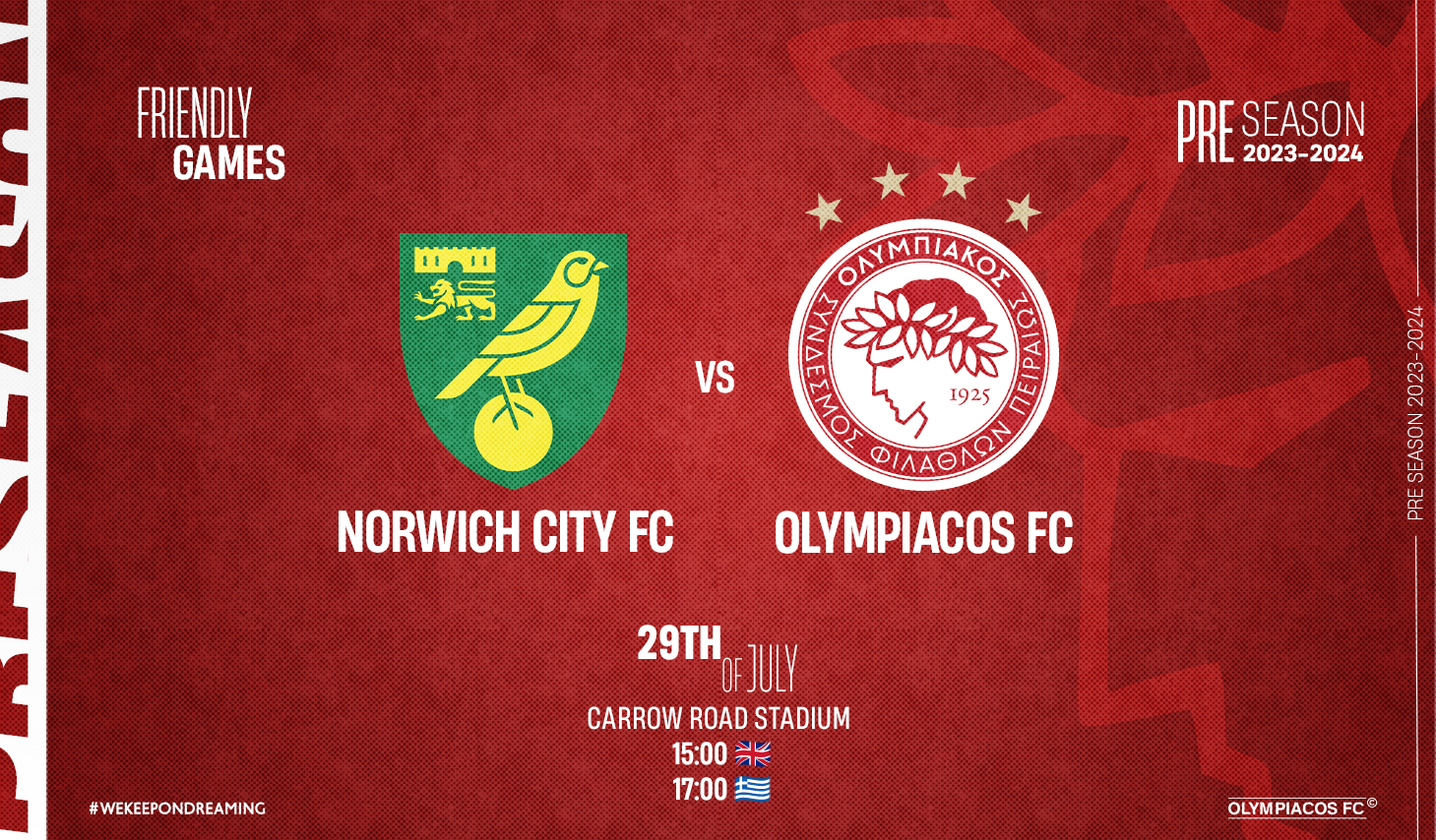 Ο Ολυμπιακός θα δώσει και δεύτερο φιλικό επί βρετανικού εδάφους. Μετά τη Ρέιντζερς (26/7, 21:45), οι «ερυθρόλευκοι» θα αντιμετωπίσουν τη Νόριτς στην Αγγλία.