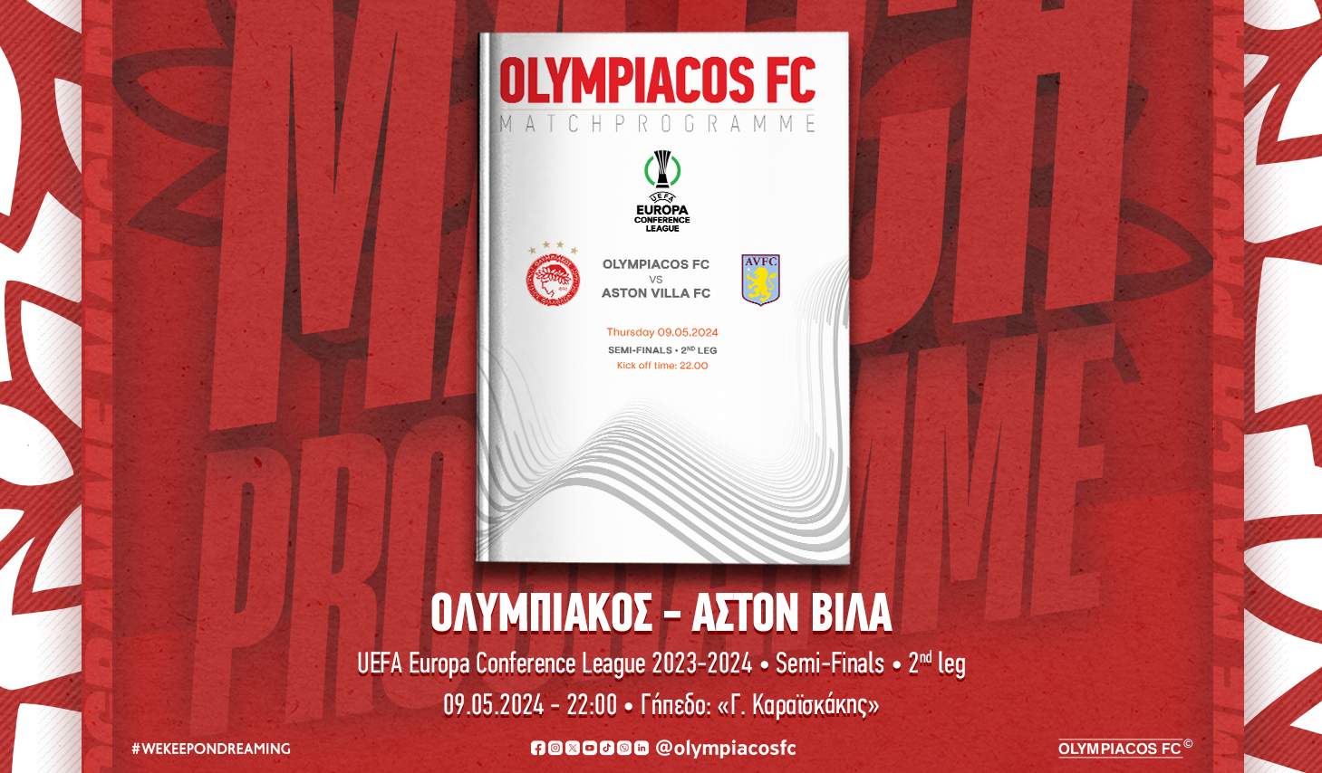 Διαβάστε το Match Programme της αναμέτρησης Ολυμπιακός – Aston Villa, του δεύτερου αγώνα για τα ημιτελικά του UEFA Conference League, στο «Γ. Καραϊσκάκης».