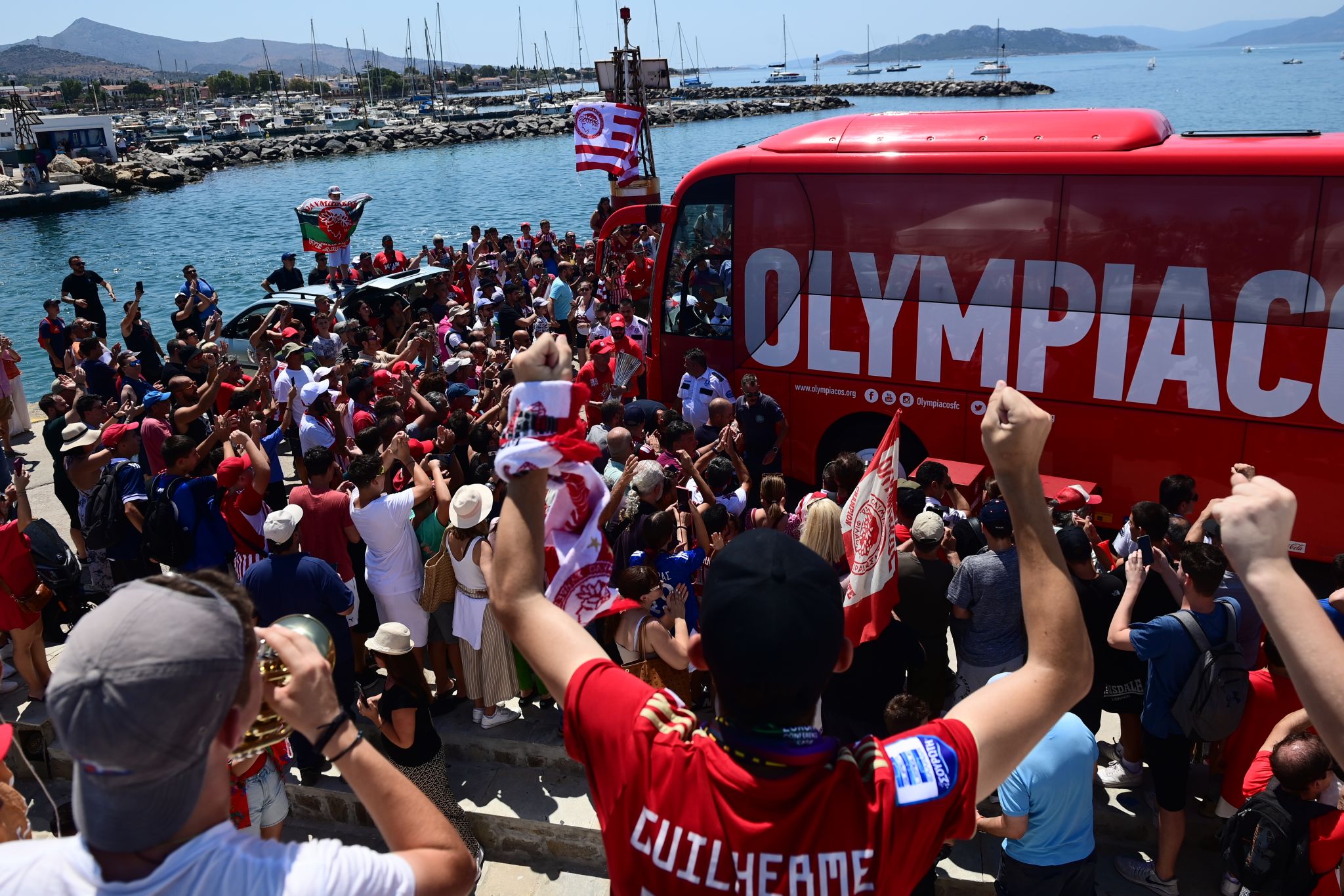 Τη στιγμή της άφιξης του καραβιού στην Αίγινα, πλήθος κόσμου ετοίμασε αποθεωτική υποδοχή, με συνθήματα και τραγούδια για τον Θρύλο. Τα τρόπαια του UEFA Europa Conference League και του UEFA Youth League τοποθετήθηκαν μπροστά από το εκκλησάκι του Αγίου Νικολάου στο λιμάνι της Αίγινας. Ο κόσμος έβγαλε αναμνηστικές φωτογραφίες και είδε από κοντά τους δύο ευρωπαϊκούς τίτλους.