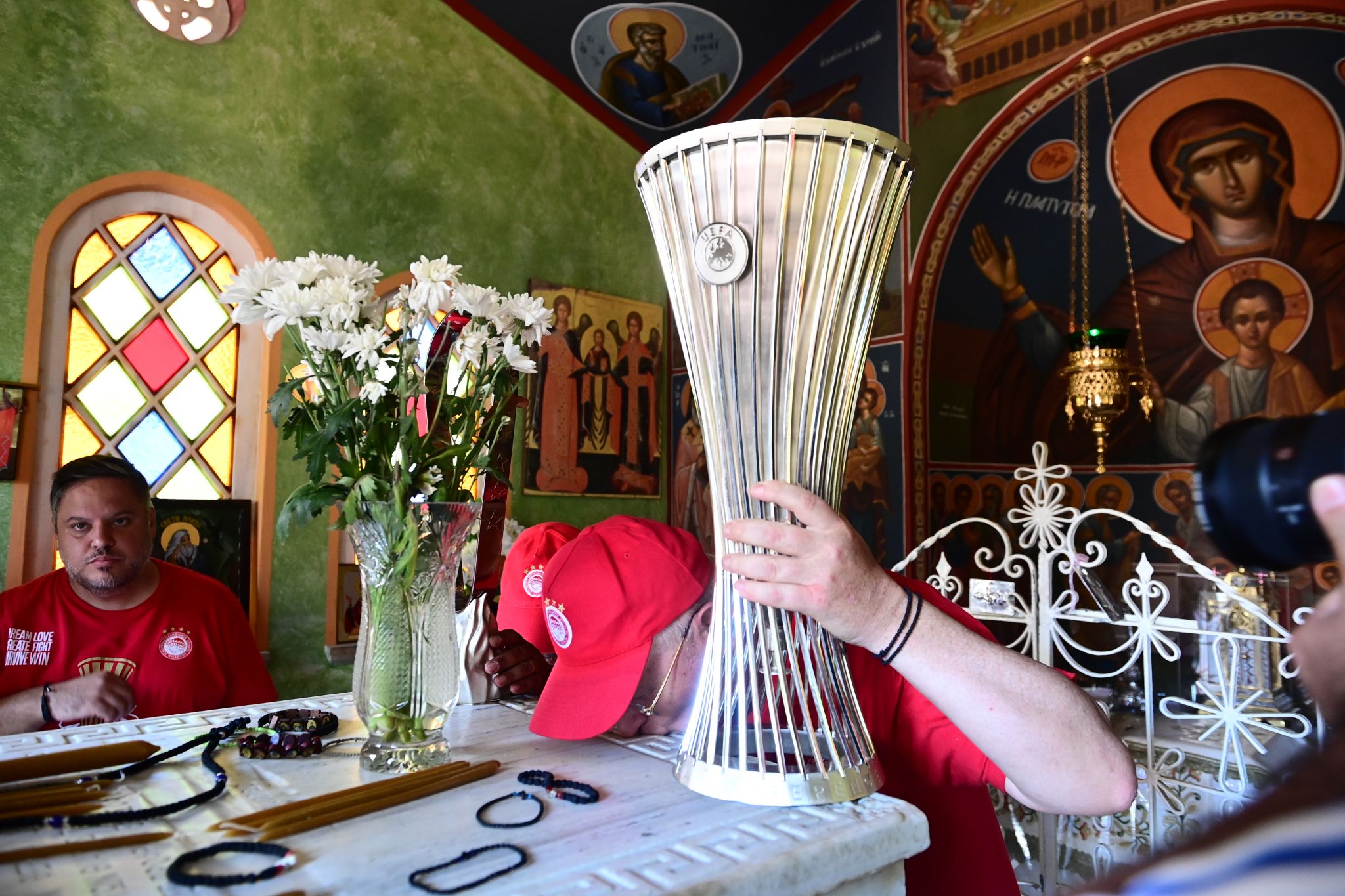 Η Αίγινα ήταν ο πρώτος σταθμός της θρυλικής περιοδείας των ευρωπαϊκών τροπαίων του Ολυμπιακού, του UEFA Europa Conference League και του UEFA Youth League.