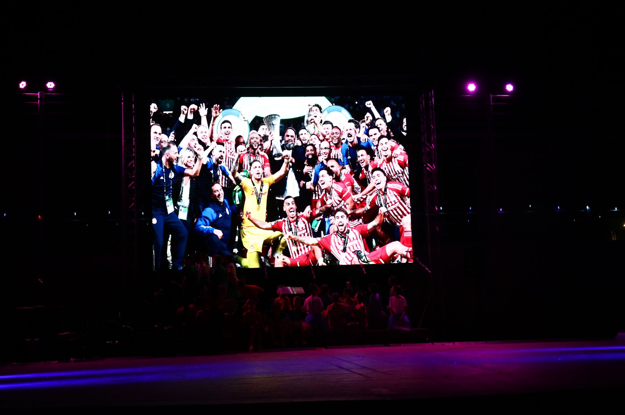 Στο Βεάκειο Θέατρο, εκατοντάδες μικροί μαθητές των εκπαιδευτηρίων της Μητρόπολης είχαν ετοιμάσει μία όμορφη εκδήλωση για τους γονείς και τους επισκέπτες που έδωσαν το «παρών», ενώ παράλληλα προβλήθηκε βίντεο με την τεράστια επιτυχία του Ολυμπιακού, την κατάκτηση του UEFA Europa Conference League. Κατά τη διάρκεια της προβολής του βίντεο τα παιδιά τραγουδούσαν τον ύμνο του Ολυμπιακού και χειροκρότησαν τη στιγμή που η ομάδα σήκωνε το Ευρωπαϊκό τρόπαιο.