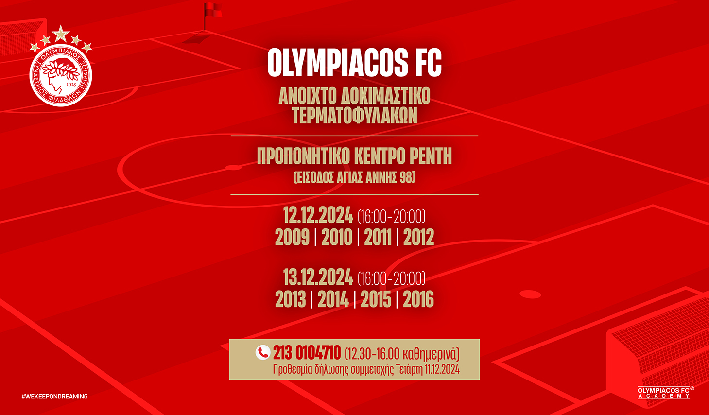 Η διεύθυνση ακαδημίας Ολυμπιακού, ανακοινώνει την πραγματοποίηση ανοιχτού δοκιμαστικού τερματοφυλάκων στο προπονητικό κέντρο στο Ρέντη για ποδοσφαιριστές γεννημένους από το 2009 μέχρι και το 2016. Στις 12/12/2024 θα προπονηθούν παιδιά γεννημένα από το 2009 μέχρι και το 2012, ενώ την επόμενη ημέρα στις 13/12/2024 θα δοκιμαστούν στο Ρέντη παίκτες οι οποίοι έχουν γεννηθεί από το 2013 μέχρι και το 2016.