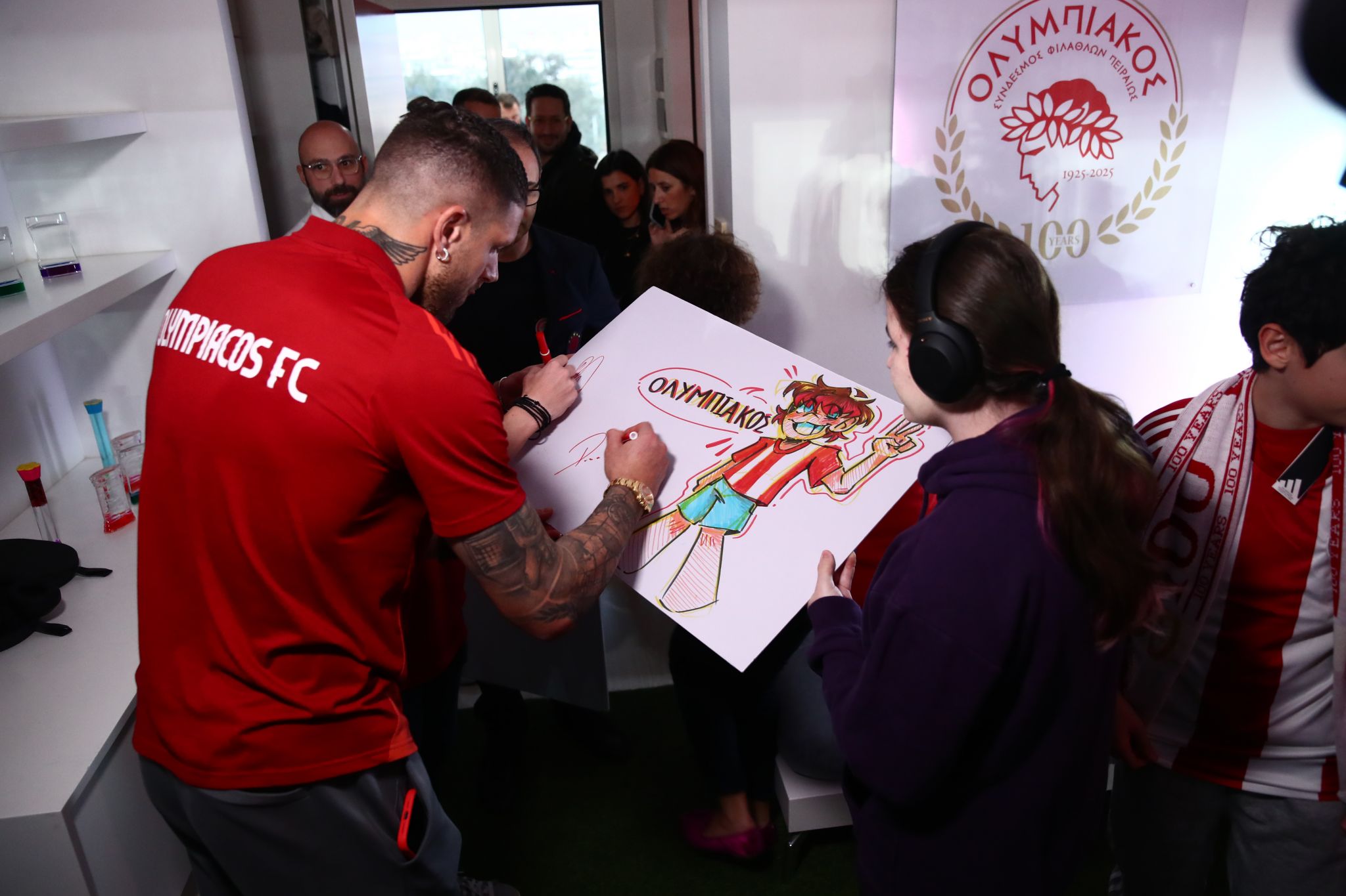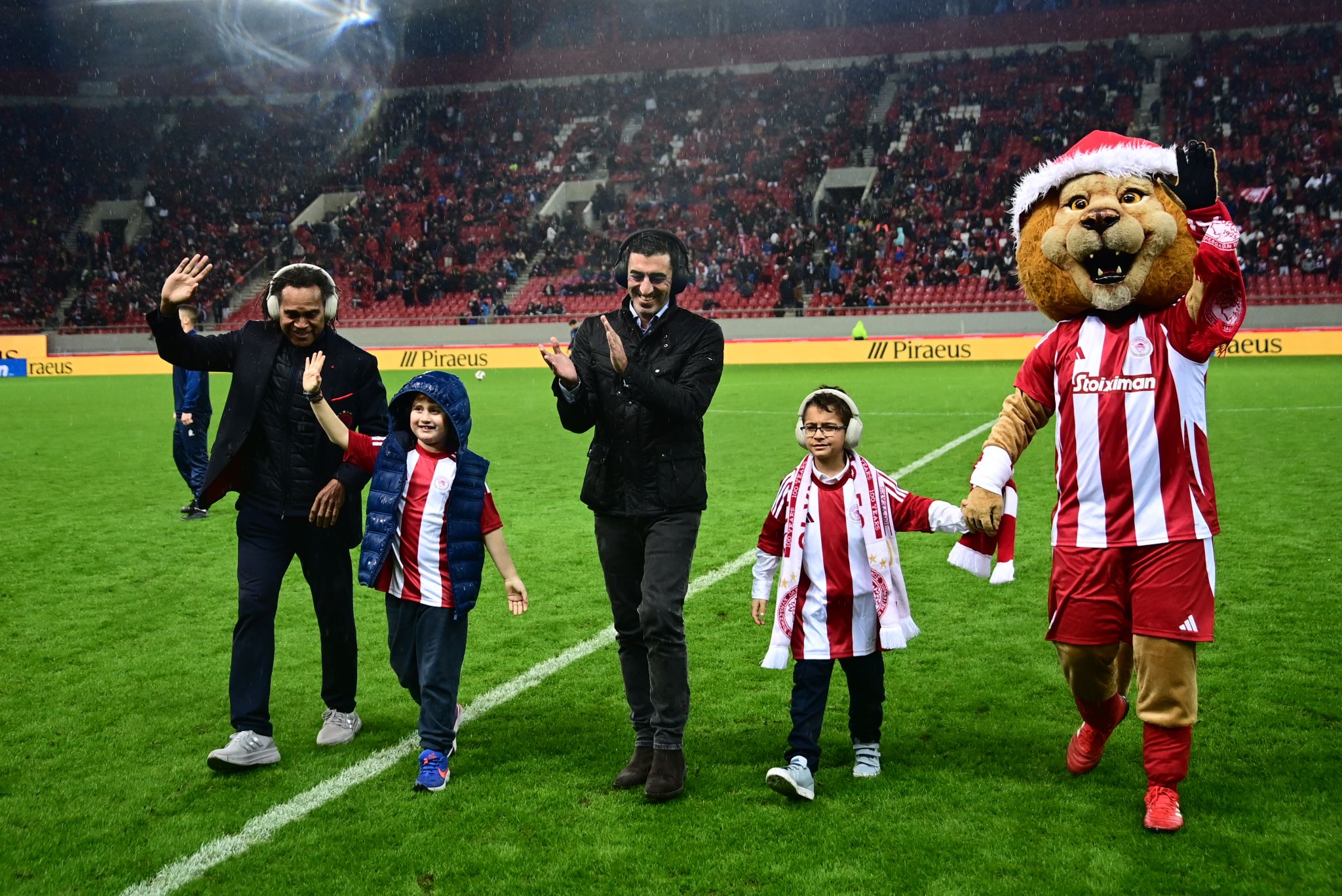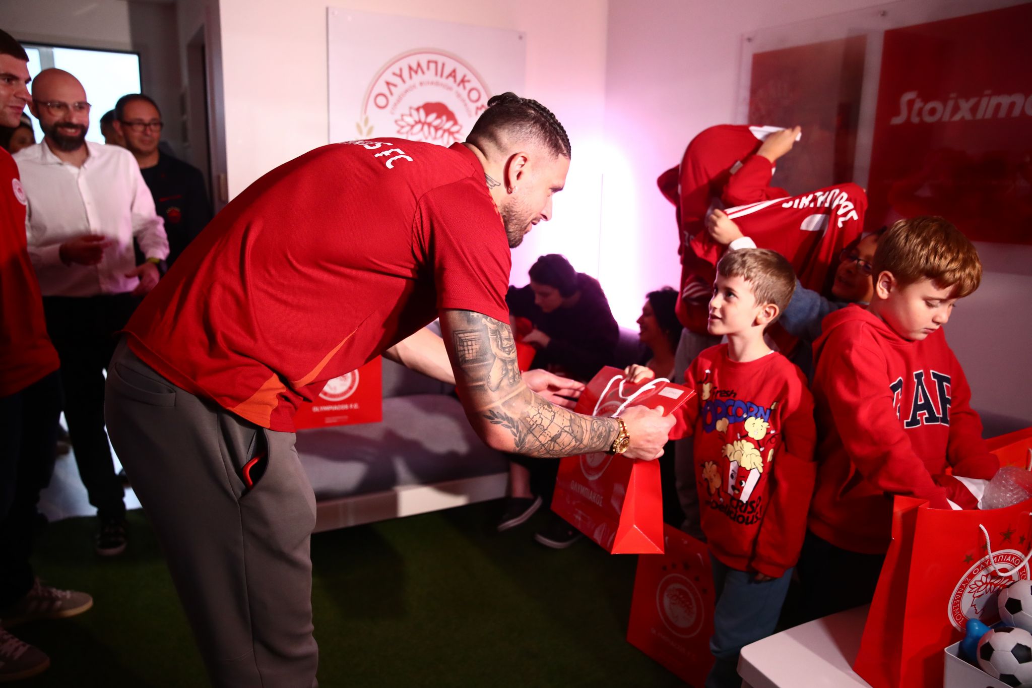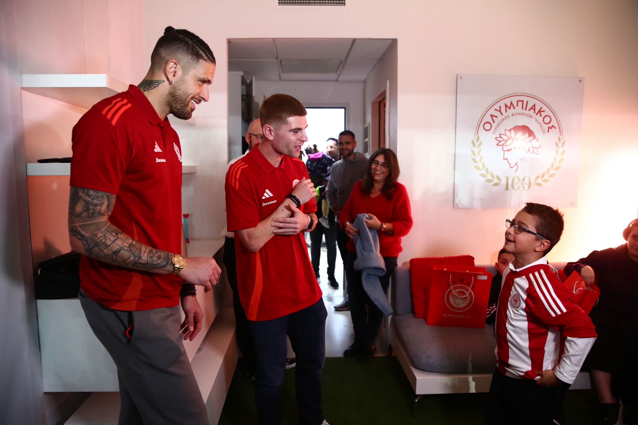 Πριν την έναρξη της αναμέτρησης οι ποδοσφαιριστές της ομάδας Αλέξανδρος Πασχαλάκης, Απόστολος Αποστολόπουλος, βρέθηκαν σε σουίτα του «Γ. Καραϊσκάκης», η οποία ήταν ειδικά διαμορφωμένη για να φιλοξενήσει τα παιδιά, και μοίρασαν χαμόγελα και «ερυθρόλευκα» δώρα.