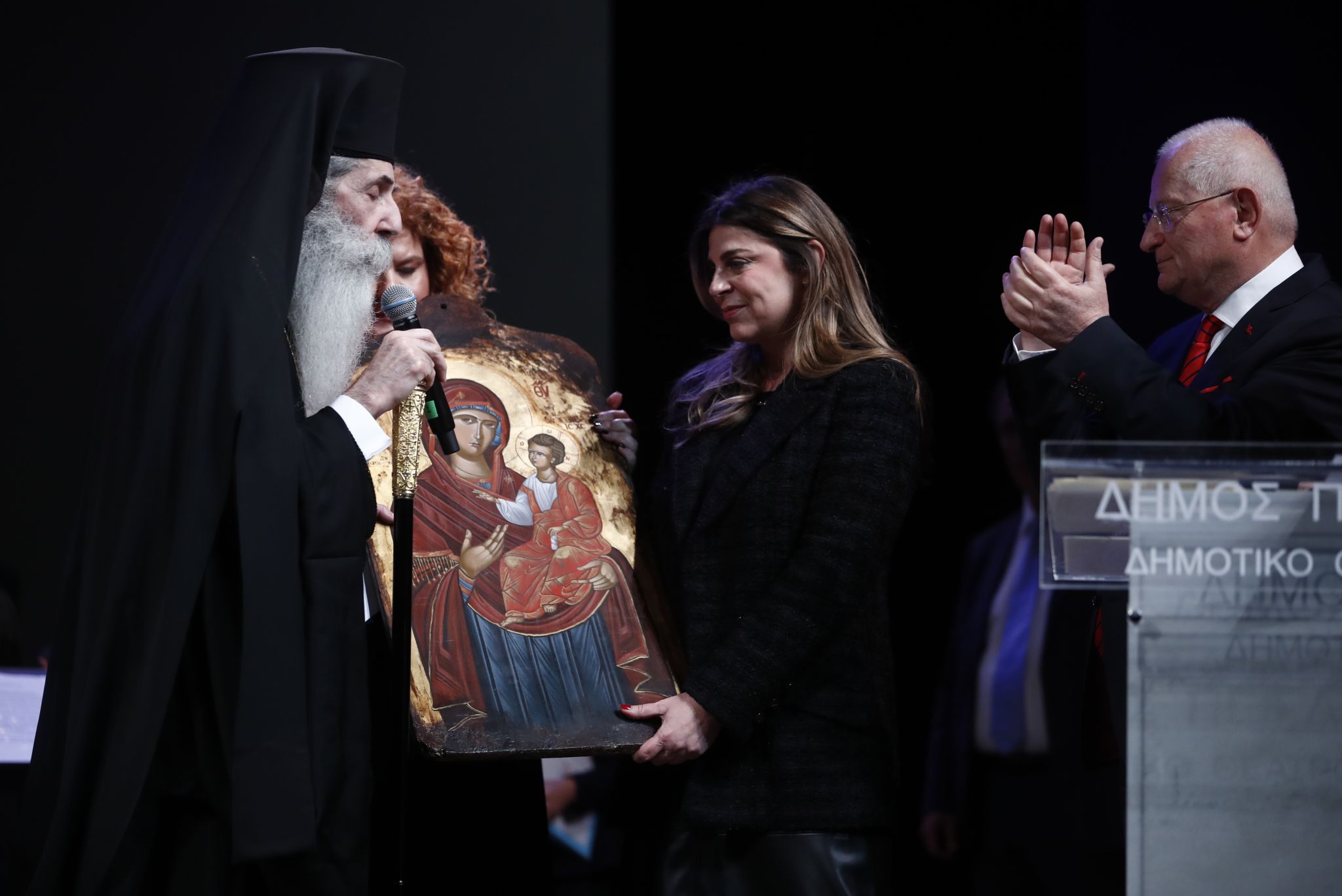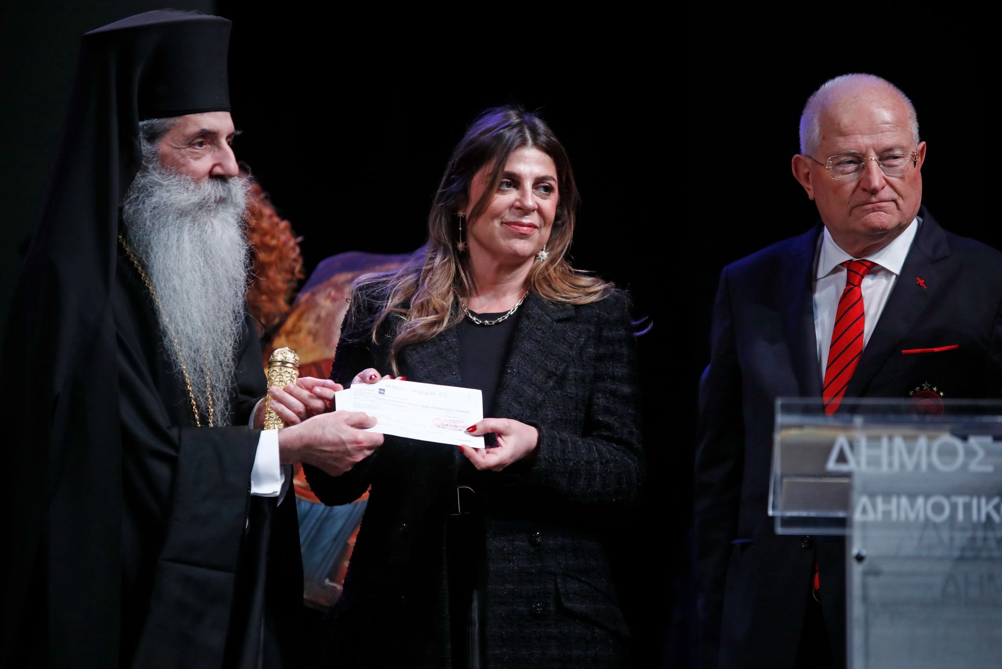 Ο Σεβασμιώτατος Μητροπολίτης κ.κ. Σεραφείμ παρέδωσε στη κυρία Αθανασία Μαρινάκη ένα εικόνισμα της Παναγίας και αφού τη χαρακτήρισε πρότυπο μητέρας και συζύγου, της ευχήθηκε ο Θεός να είναι πάντα κοντά της.