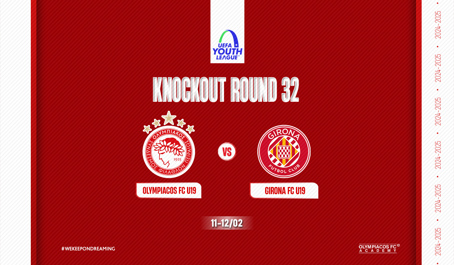 Την Girona FC πρόκειται να αντιμετωπίσουν οι Νέοι του Ολυμπιακού στη συνέχεια των υποχρεώσεών τους στην Ευρώπη και συγκεκριμένα στη φάση των «32» του UEFA Youth League. Στην κλήρωση που πραγματοποιήθηκε το μεσημέρι της Παρασκευής στη Νιόν της Ελβετίας, ο πρωταθλητής Ευρώπης της σεζόν 2023-24, Ολυμπιακός, κληρώθηκε με την Girona FC της Ισπανίας.