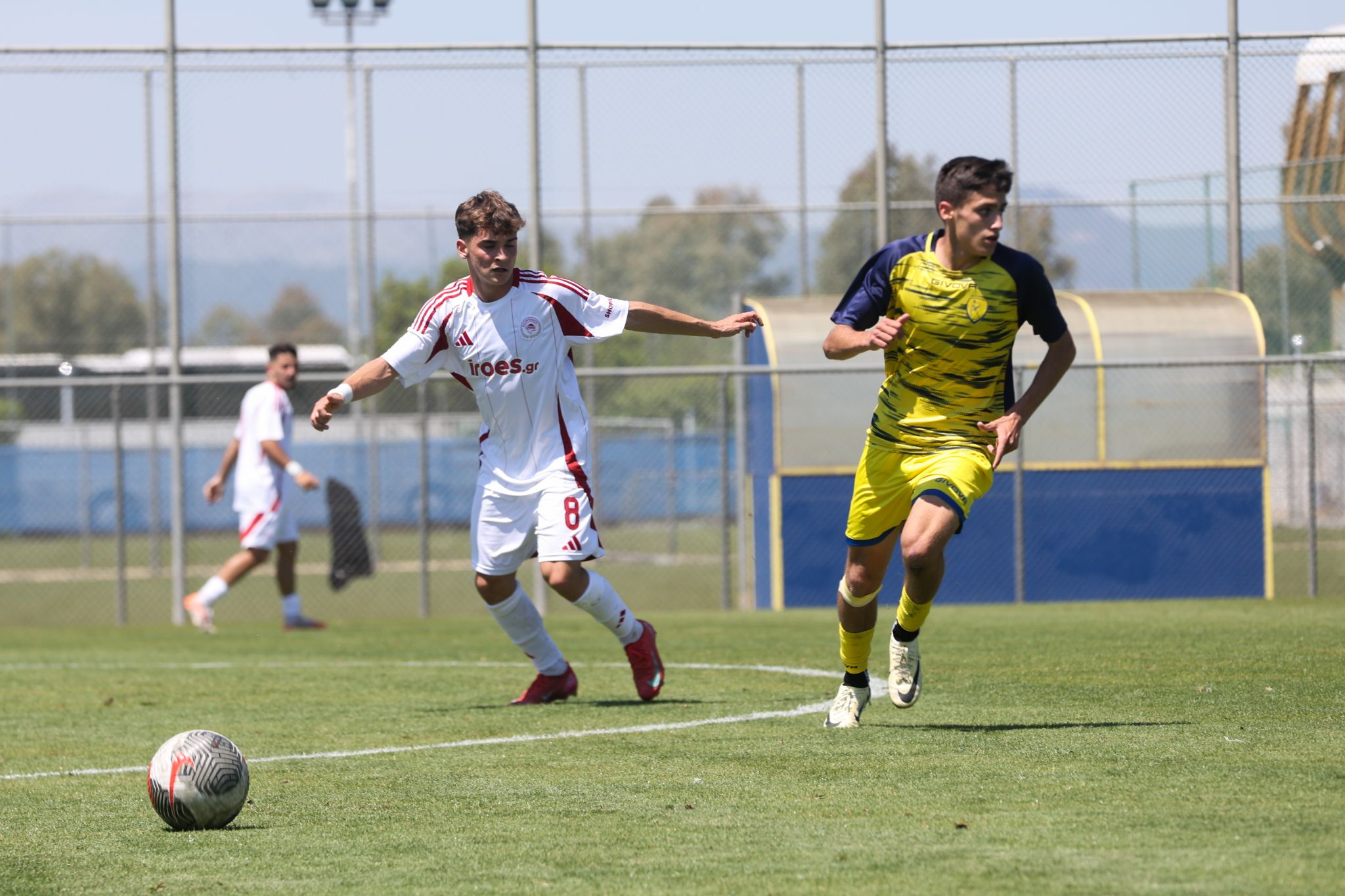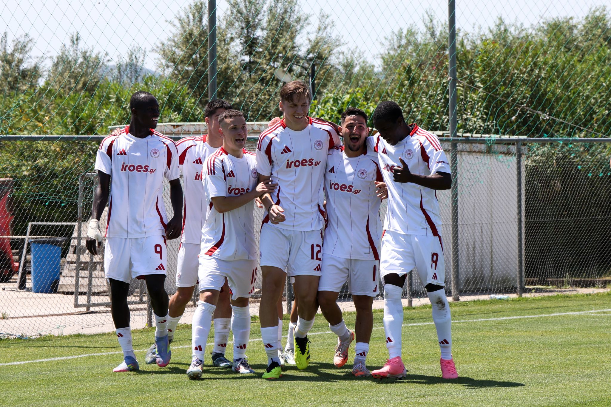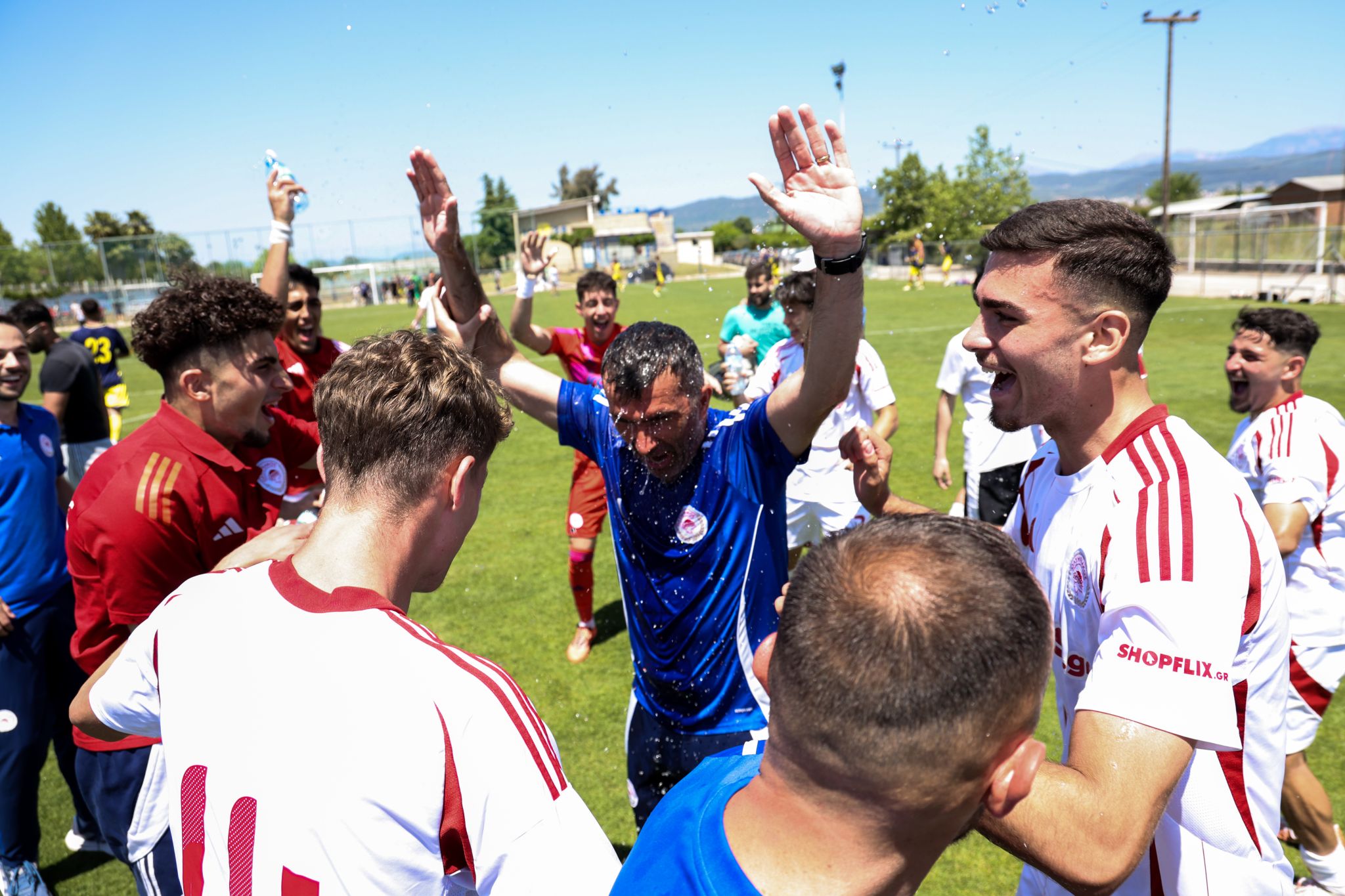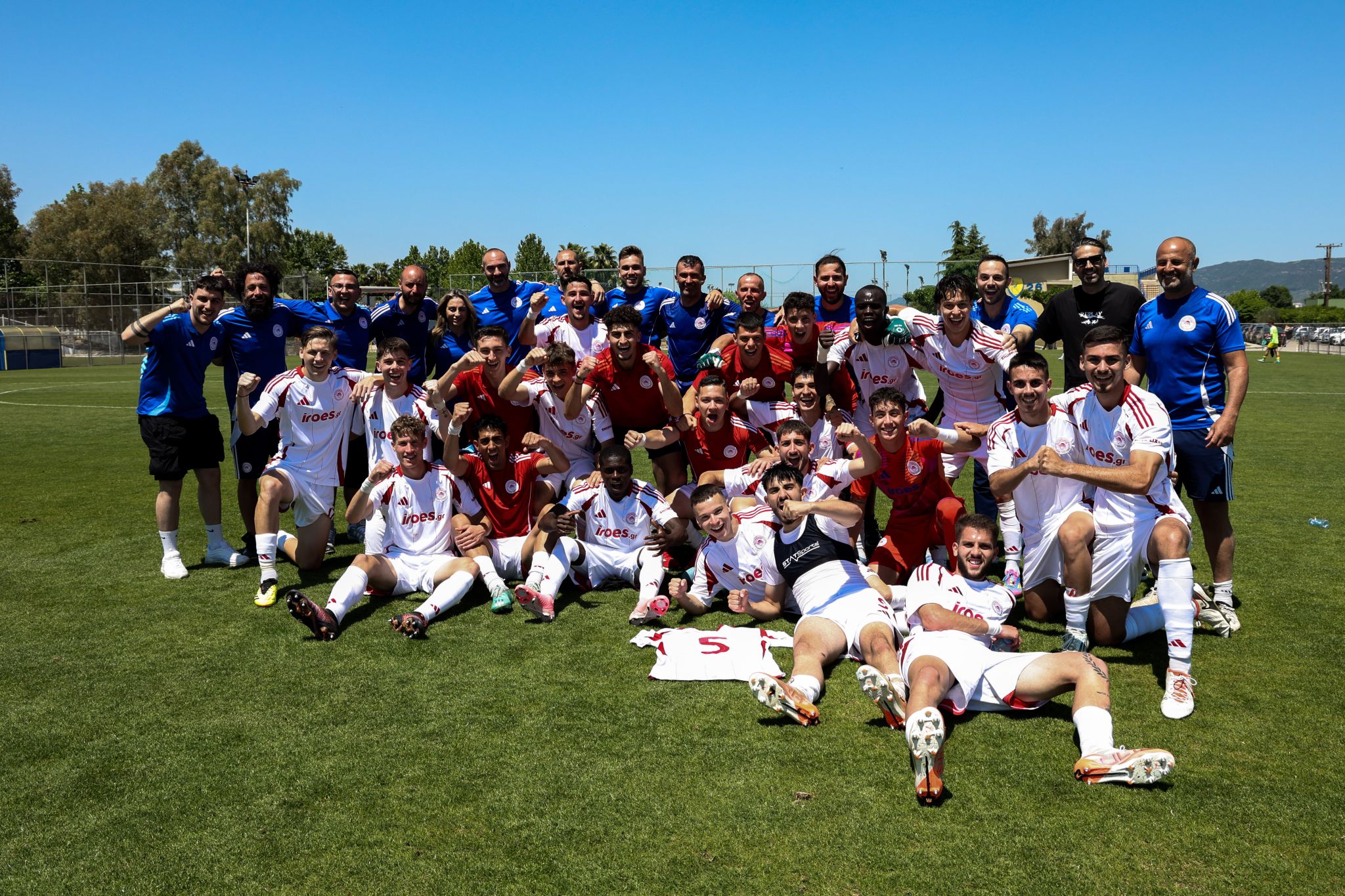 Μετά το σφύριγμα της λήξης οι «ερυθρόλευκοι» ποδοσφαιριστές πανηγύρισαν στον αγωνιστικό χώρο και τ’ αποδυτήρια του γηπέδου τη μαθηματική κατάκτηση του πρωταθλήματος της Super League Κ19 για τη σεζόν 2024-2025.