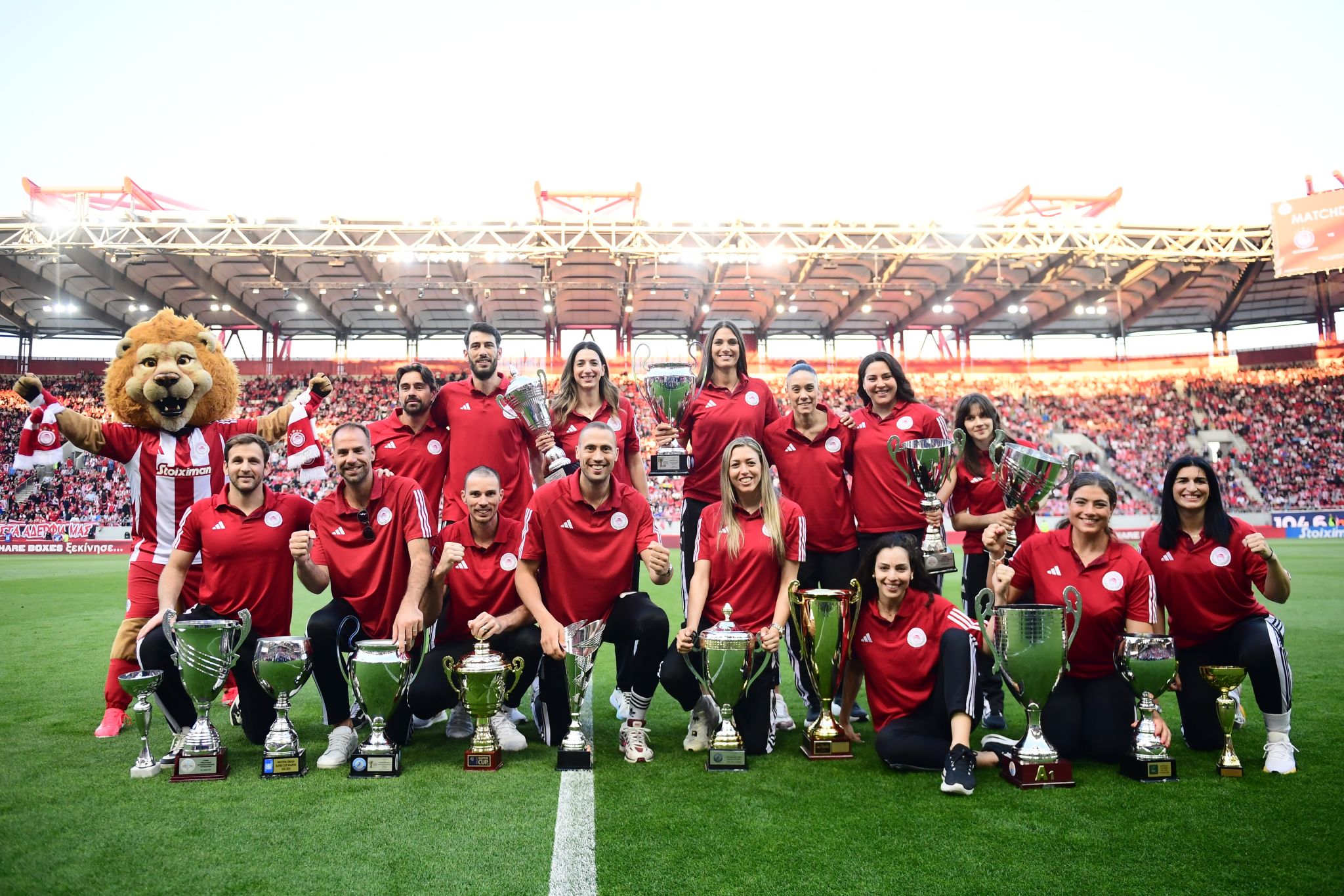 Από το μικρόφωνο κλήθηκε στο χορτάρι ο Στρατηγός της ομάδας, ο προπονητής Χοσέ Λουίς Μεντιλίμπαρ, όπως και ο Στρατηγικός Σύμβουλος της ΠΑΕ Ολυμπιακός Κριστιάν Καρεμπέ, μαζί με τον Αθλητικό Διευθυντή Ντάρκο Κοβάσεβιτς. Οι βοηθοί προπονητή Αντόνιο Χοσέ Ρουίθ Πέρεθ, Φρανθίσκο Μανουέλ Ρίκο Κάστρο, Σωτήρης Συλαϊδόπουλος, όπως και όλο το ιατρικό τιμ, μαζί με τον τιμ μάνατζερ Θοδωρή Κοκκινάκη, το staff και ασφαλώς το ιατρικό τιμ των «ερυθρόλευκων», οι άνθρωποι πίσω από τις επιτυχίες.
