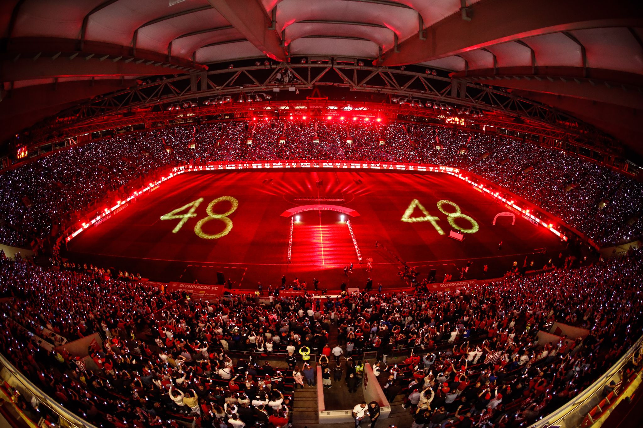 Από εκεί και πέρα με την ολοκλήρωση της 5ης αγωνιστικής των Playoffs της Stoiximan Super League, ο Ολυμπιακός διαμόρφωσε όπως έπρεπε τον αγωνιστικό χώρο του «Γ. Καραϊσκάκης» για να υποδεχτεί το 48ο πρωτάθλημα του συλλόγου. Το χορτάρι του ναού του Θρύλου κόσμησαν τα 47 πρωταθλήματα που είχε κατακτήσει η ομάδα μέχρι πρότινος και ο διάδρομος των επιτυχιών προς το βάθρο του 48ου, έκλεινε με τα δύο Ευρωπαϊκά του Ολυμπιακού και ο λόγος φυσικά για το UEFA Europa Conference League και το UEFA Youth League. Μέχρι να στηθεί το υπέροχο αυτό σκηνικό με τις αμέτρητες κούπες του Θρύλου, στα μάτριξ του γηπέδου προβλήθηκε βίντεο με όλα τα γκολ του Θρύλου στο φετινό πρωτάθλημα, αλλά και βίντεο-αφιέρωμα με τους εορτασμούς των 100 χρόνων ζωής του συλλόγου.