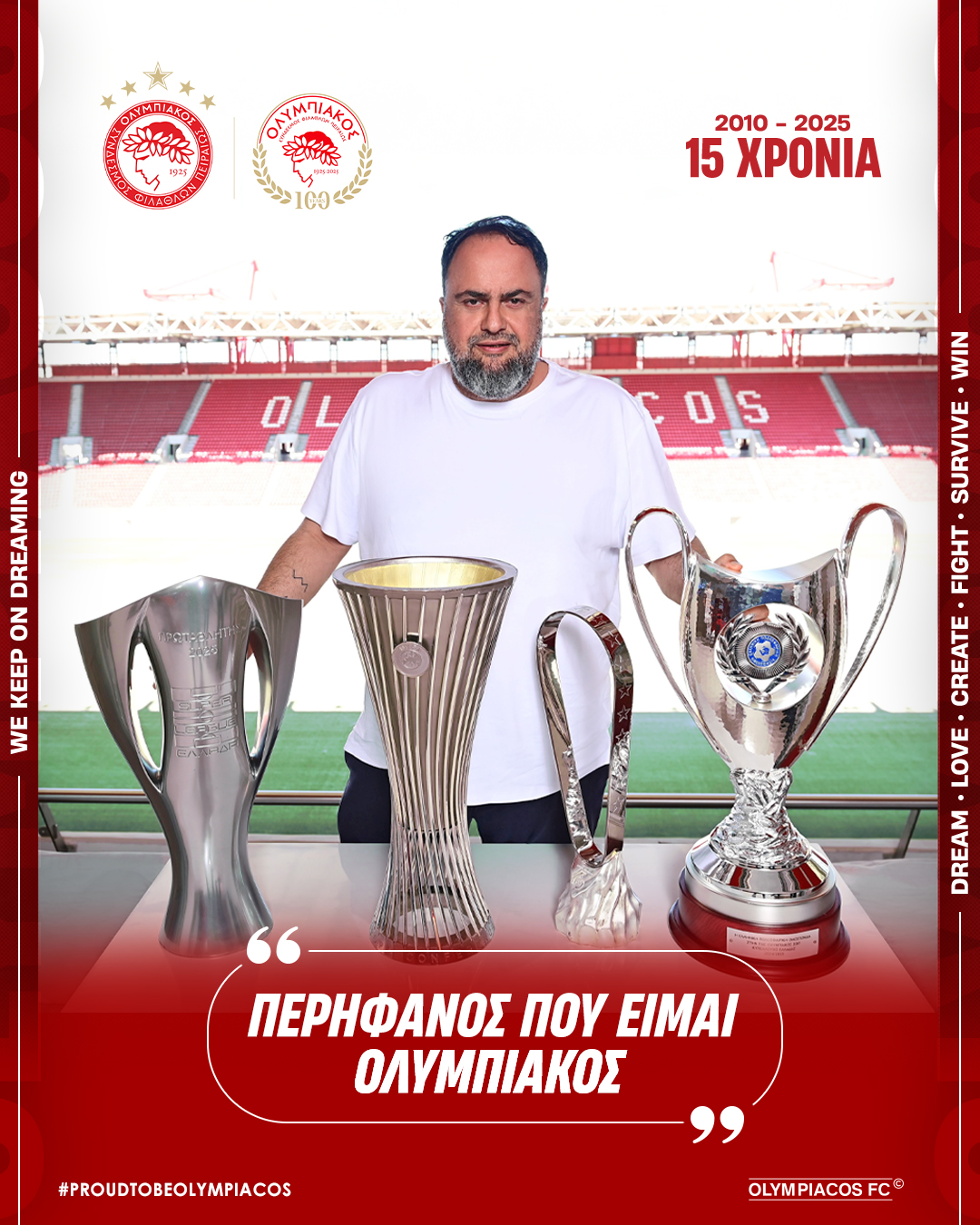 Φέτος, σε ένα έτος ορόσημο για τον Σύλλογο, ολόκληρη η οικογένεια του Ολυμπιακού γιορτάσαμε με λαμπρότητα στον Πειραιά και σε όλη την Ελλάδα 100 χρόνια ένδοξης ιστορίας μας. Κοιτάμε ψηλά και συνεχίζουμε να ονειρευόμαστε! ΖΗΤΩ Ο ΟΛΥΜΠΙΑΚΟΣ!