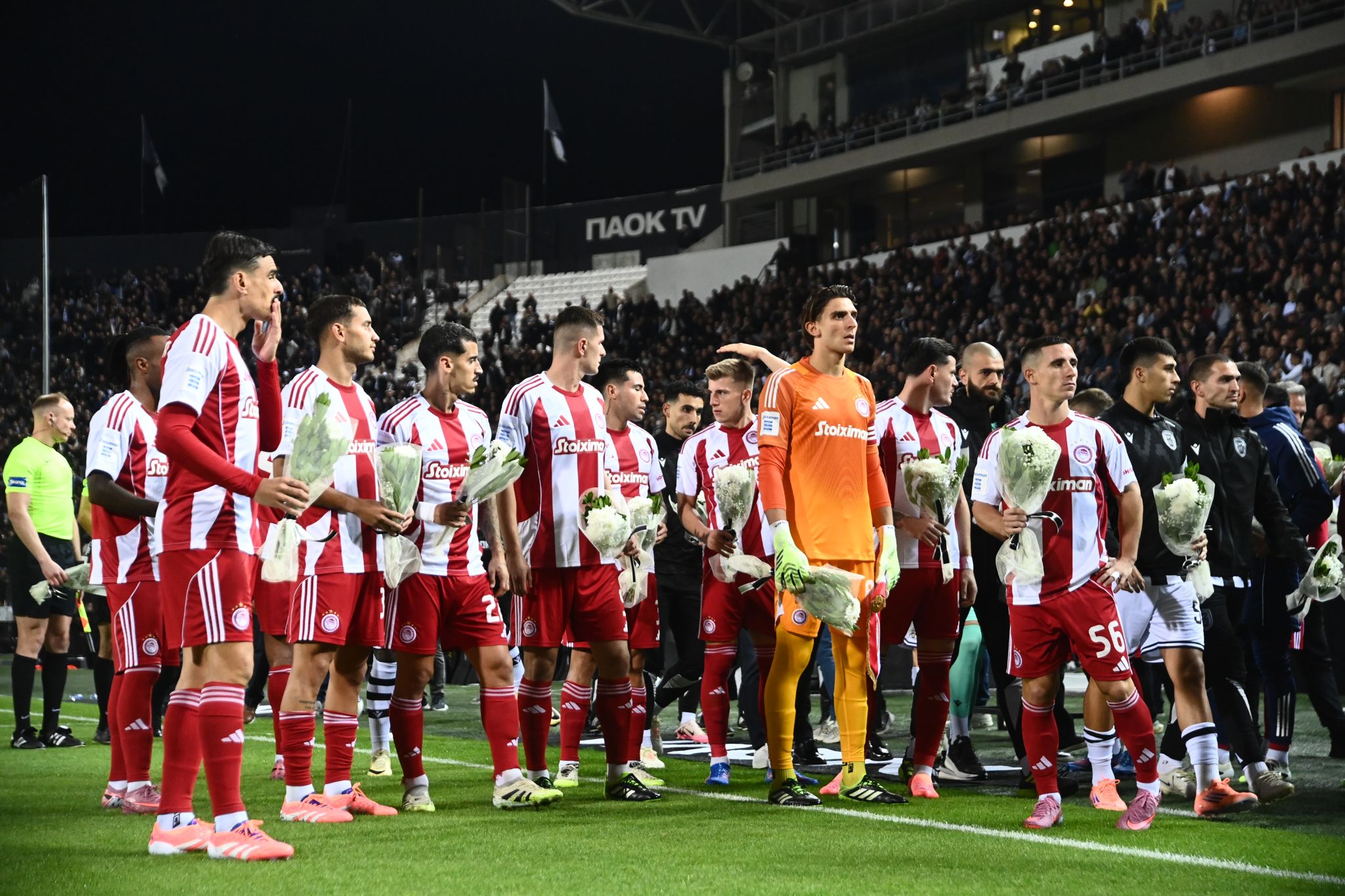 Να σημειωθεί πως πριν την έναρξη του αγώνα σύσσωμη η αποστολή του Ολυμπιακού άφησε λουλούδια στο γήπεδο της Τούμπας, στη μνήμη των οπαδών του ΠΑΟΚ που έχασαν τη ζωή τους σε τροχαίο στα Τέμπη πριν από 26 χρόνια και συγκεκριμένα στις 5 Οκτωβρίου 1999.