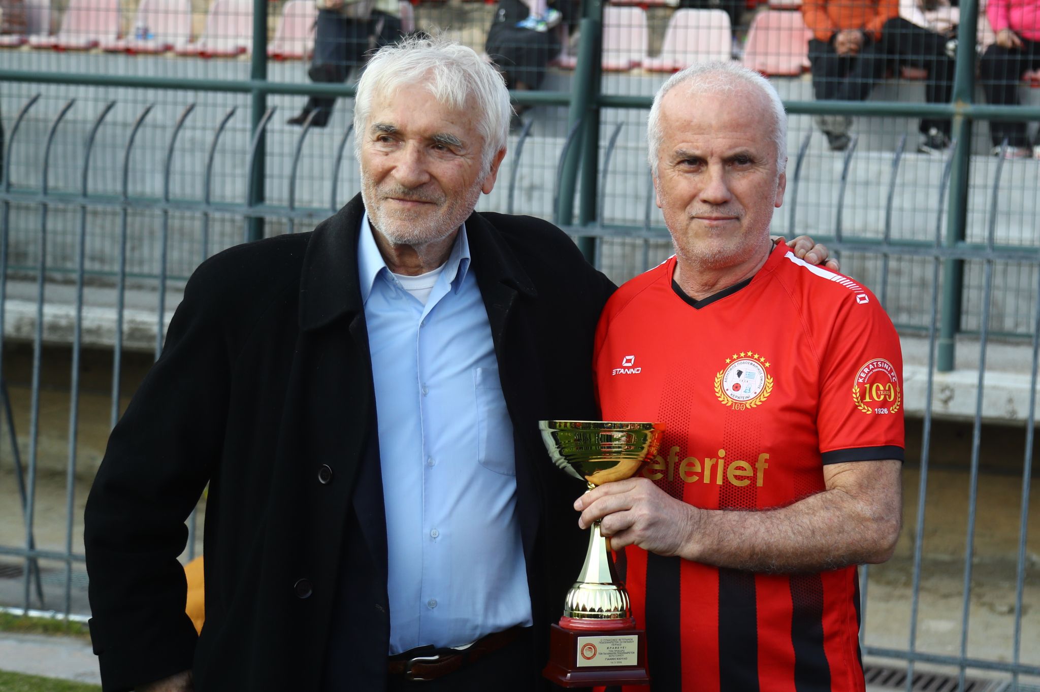 Την τιμητική πλακέτα παρέλαβε ο Πρόεδρος και Διευθύνων Σύμβουλος του «Γ. Καραϊσκάκης», Βασίλης Βασιλειάδης, ο οποίος δήλωσε τη στιγμή της βράβευσης: «Είναι ιδιαίτερη τιμή για εμάς και ευχαριστούμε το Δήμαρχο της πόλης και τους Βετεράνους της ομάδας του Κερατσινίου οι οποίοι θυμήθηκαν τον αείμνηστο Μιλτιάδη Μαρινάκη και γίνεται ο αγώνας αυτός προς τιμήν της μνήμης του. Οι Βετεράνοι του Ολυμπιακού είναι παρόντες και σε αυτόν τον αγώνα ο οποίος είναι και φιλανθρωπικού χαρακτήρα».