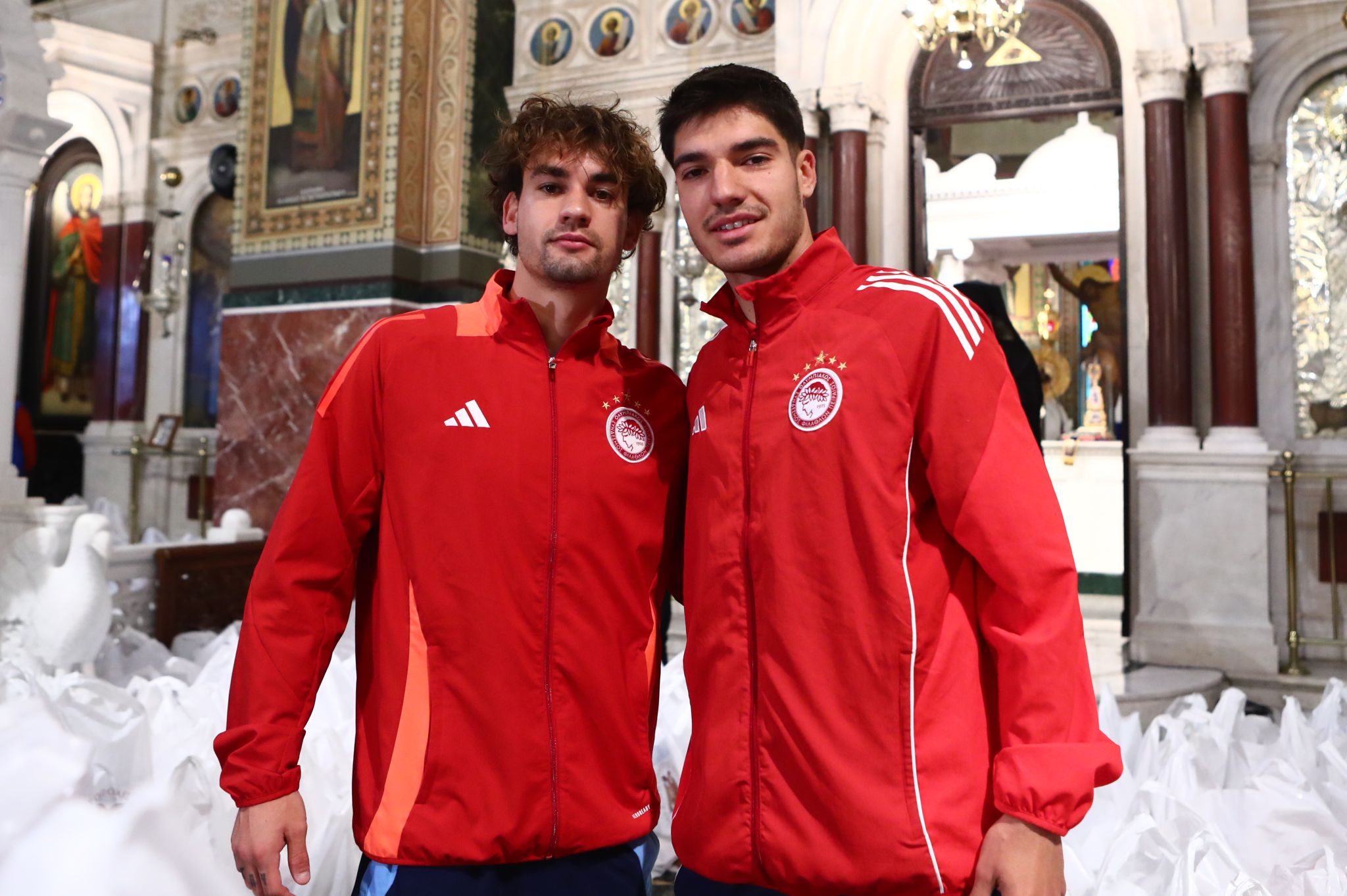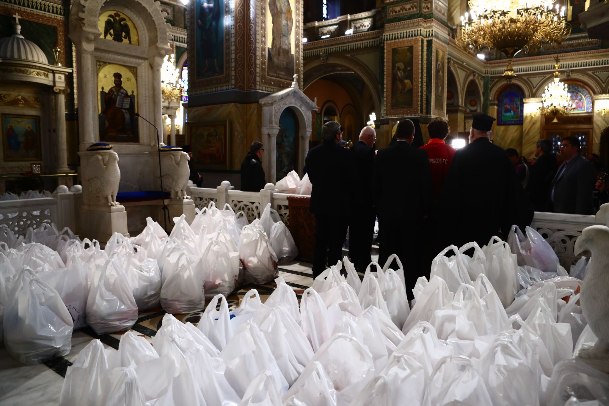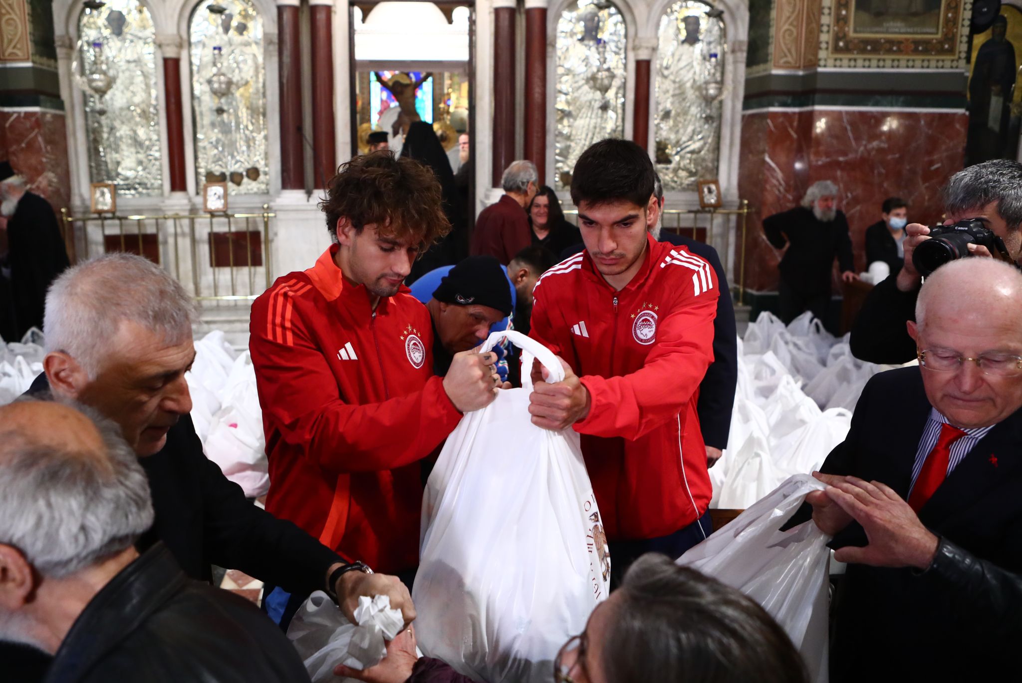 Ο Πρόεδρος και Διευθύνων Σύμβουλος του «Γ. Καραϊσκάκης», κ. Βασίλης Βασιλειάδης, ανέφερε: «Βρίσκομαι εδώ εκ μέρους του  Βαγγέλη Μαρινάκη να φέρω στον δέσποτα, τον άγιο πατέρα μας, κύριο Σεραφείμ, την επιταγή για το τραπέζι το Πασχαλινό, τις πέντε επιταγές για τη μισθοδοσία των ιερομονάχων που δεν μπορεί να καλύψει το ελληνικό δημόσιο. Όπως γνωρίζετε θα μοιραστούν εκατοντάδες δέματα στους εκατοντάδες ανθρώπους που είναι μέσα στον ιερό ναό, από Πειραιά, Δραπετσώνα, Νέο Φάληρο και Ρέντη, προκειμένου να ανακουφιστεί όσο το δυνατόν περισσότερο η οικογένεια, διότι οι εποχές που είναι, είναι δύσκολες και η ακρίβεια δυστυχώς ταλανίζει το ελληνικό νοικοκυριό. Είναι μαζί μου ο Αργύρης και ο Νίκος, οι ποδοσφαιριστές του Ολυμπιακού και συντρέχουμε όλοι μαζί το έργο του δέσποτα Σεραφείμ. Καλό Πάσχα σε όλους».
