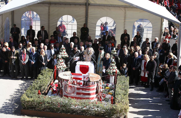 Μετά το πέρας της δέησης, την οποία τέλεσε ο Μητροπολίτης Πειραιώς και Φαλήρου, Σεβασμιότατος κ.κ. Σεραφείμ, ακολούθησε η κατάθεση στεφάνων στο μνημείο του Δήμου Πειραιά, απέναντι από το γήπεδο Καραϊσκάκη. Ο Πρόεδρος της ΠΑΕ Ολυμπιακός και πρώτος Δημοτικός Σύμβουλος Πειραιά, κ. Βαγγέλης Μαρινάκης, στάθηκε δίπλα στον Δήμαρχο Πειραιά, κ. Γιάννη Μώραλη και απόλαυσαν τον πύρινο λόγο του προέδρου της ΠΕΦΟ, κ. Κώστα Μπαρμπή, ο οποίος όπως πάντα, συγκίνησε. Κατέθεσαν στεφάνια και αφού τήρησαν, εκ νέου, ενός λεπτού σιγή, έκλεισαν τη λιτή τελετή με την ανάκρουση του Εθνικού Ύμνου.