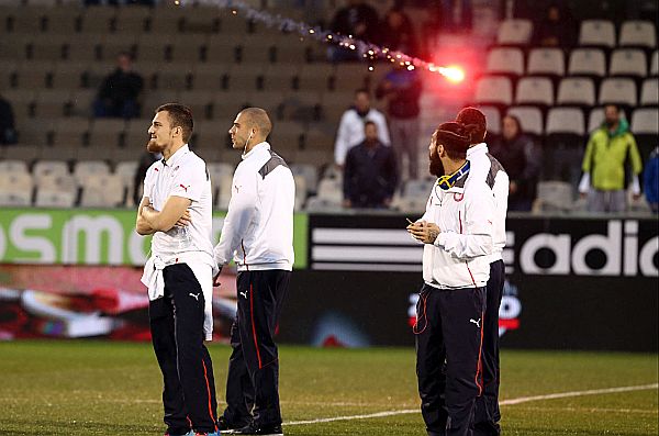 Before the second half, while both teams were making their entrance on the pitch, Panathinaikos fans aimed at Olympiacos players and staff and fired away a flare that hit Pajtim Kasami’s arm!