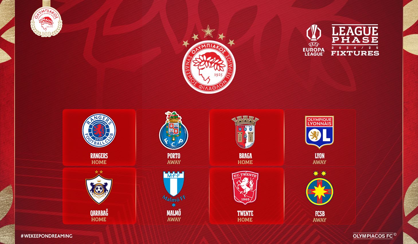 The draw follows the competition’s new format and the red-and-white outfit will play against 8 teams in total: four matches at home in G. Karaiskakis and four ones away.