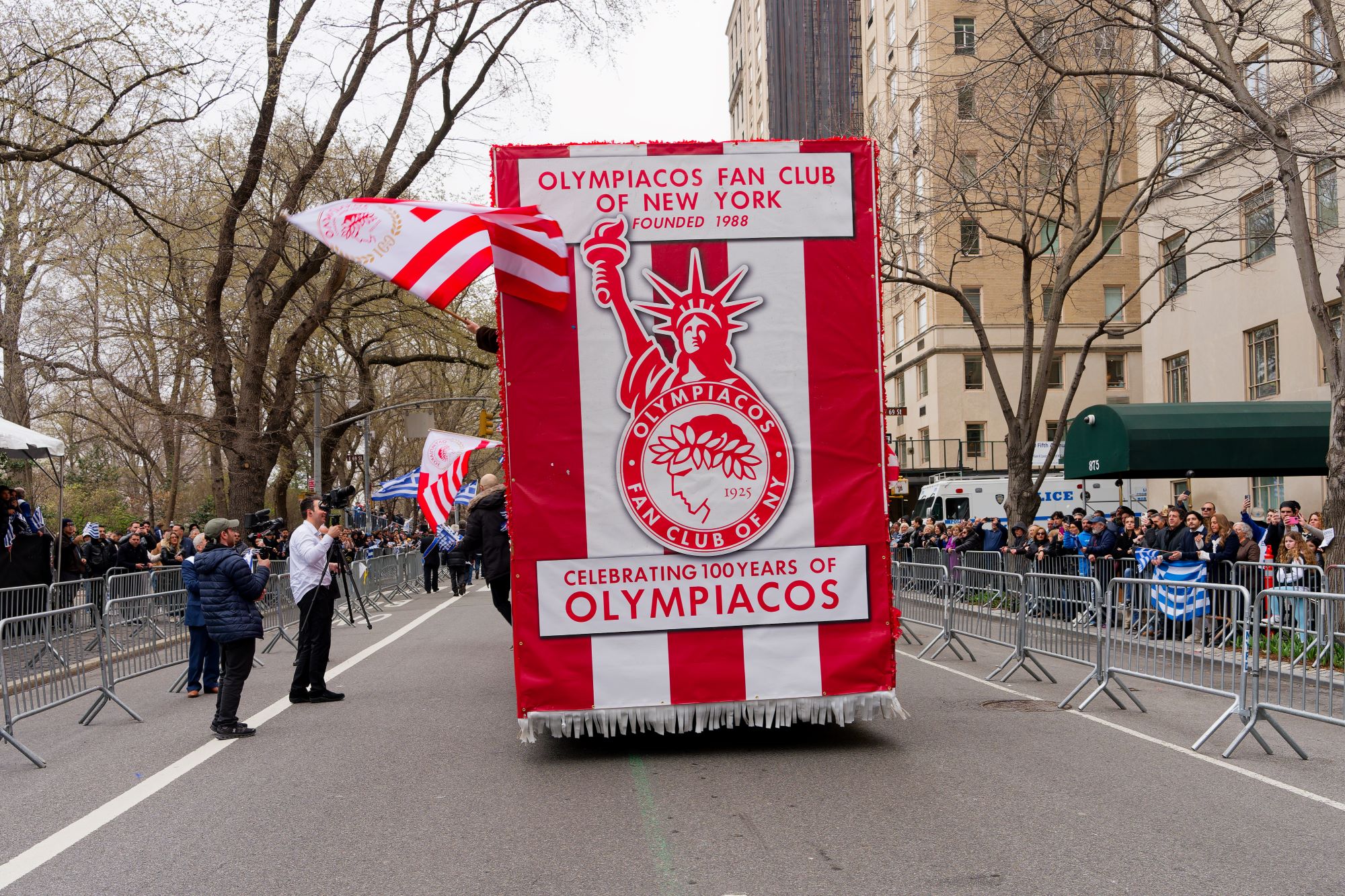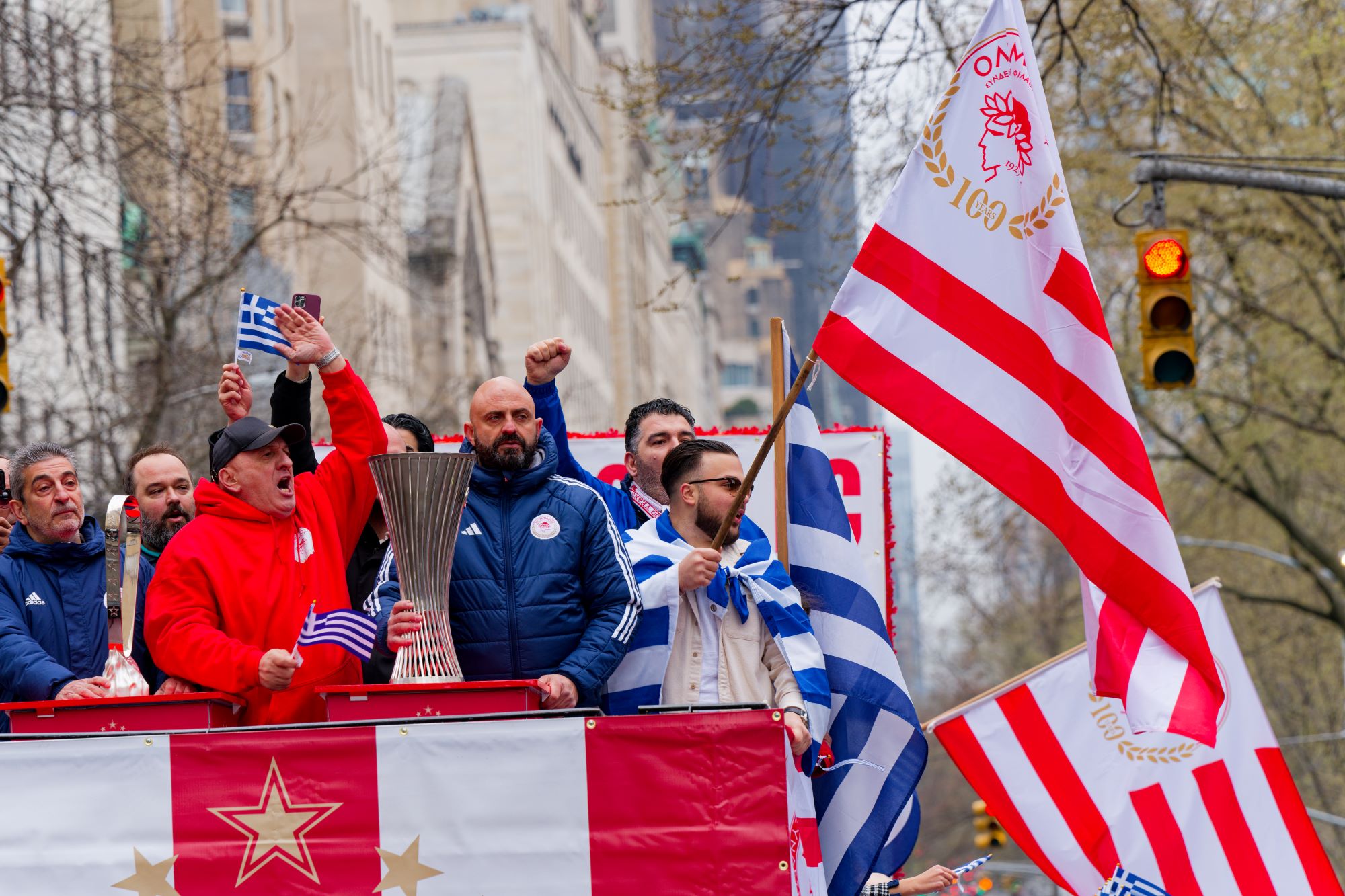 Greek-American Olympiacos fans paraded on a float decorated in the club’s colors, proudly displaying the two European trophies of the legendary team.