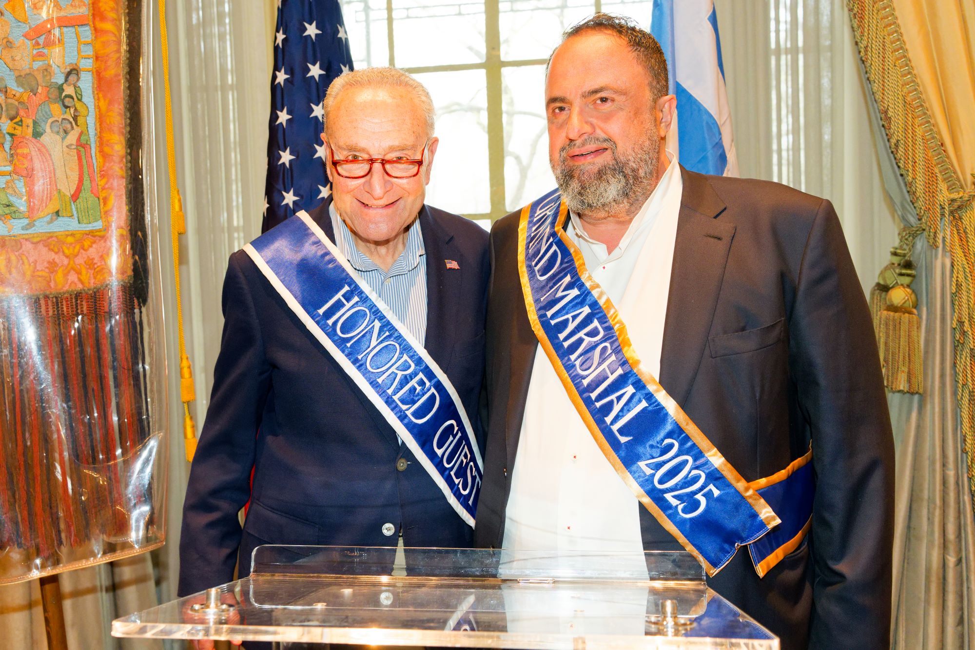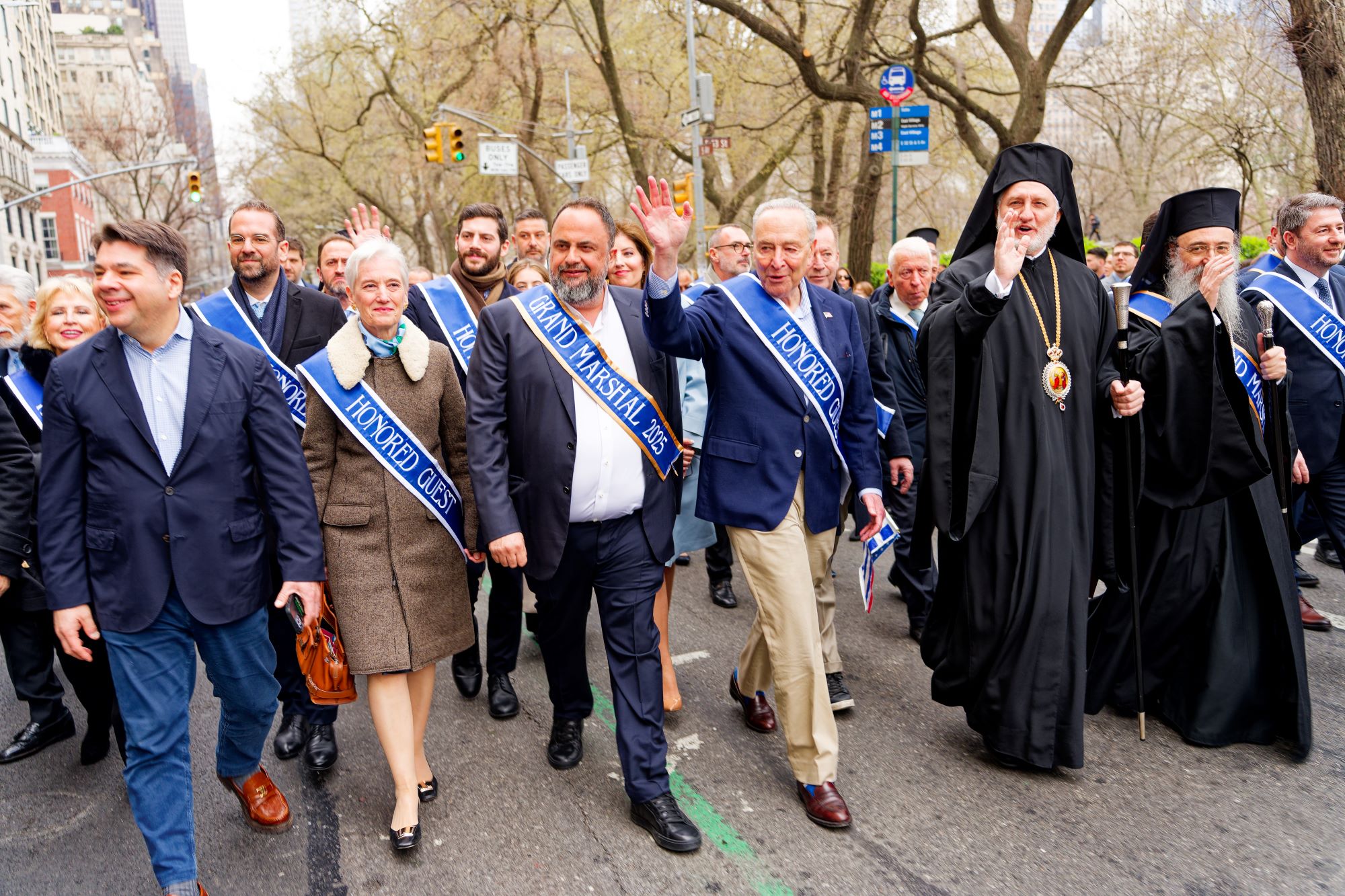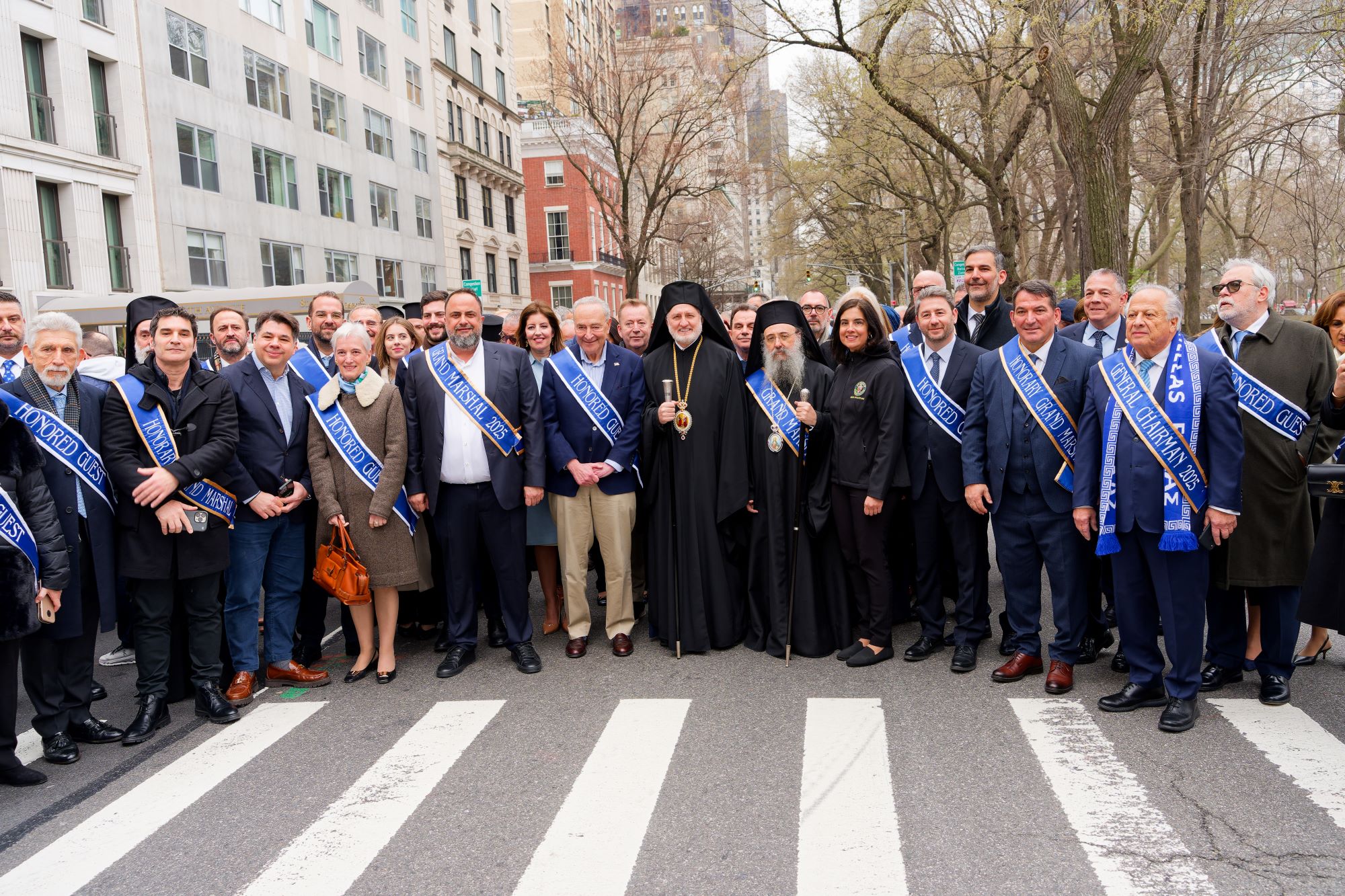 Alongside the leader of Olympiacos FC, other honored Grand Marshals included General Andrew Poppas and Metropolitan Chrysostomos of Patras. Among the distinguished guests were Archbishop Elpidophoros of America, U.S. Senate Minority Leader Chuck Schumer, and former U.S. Ambassador to Greece, Mr. George Tsounis.