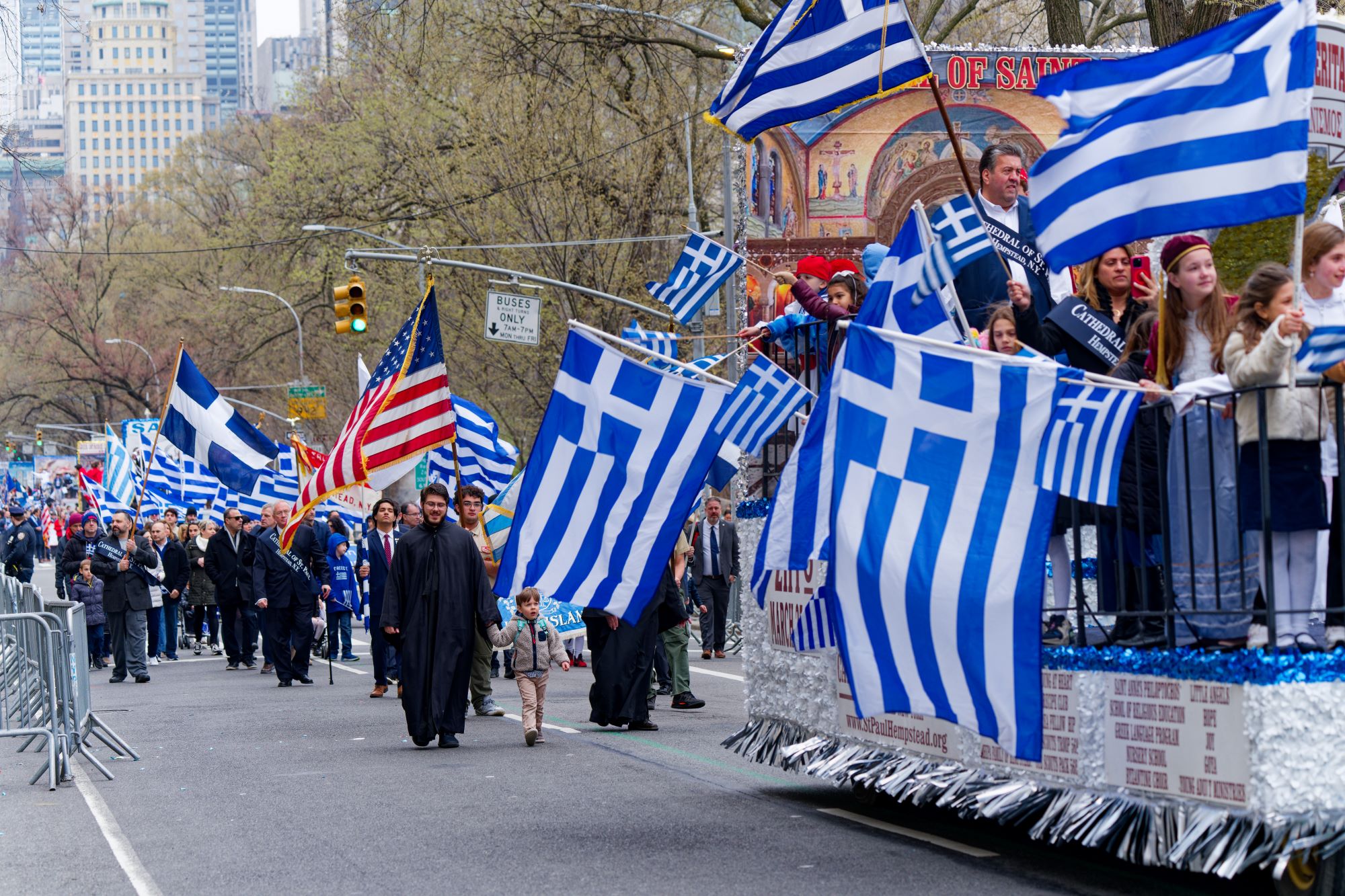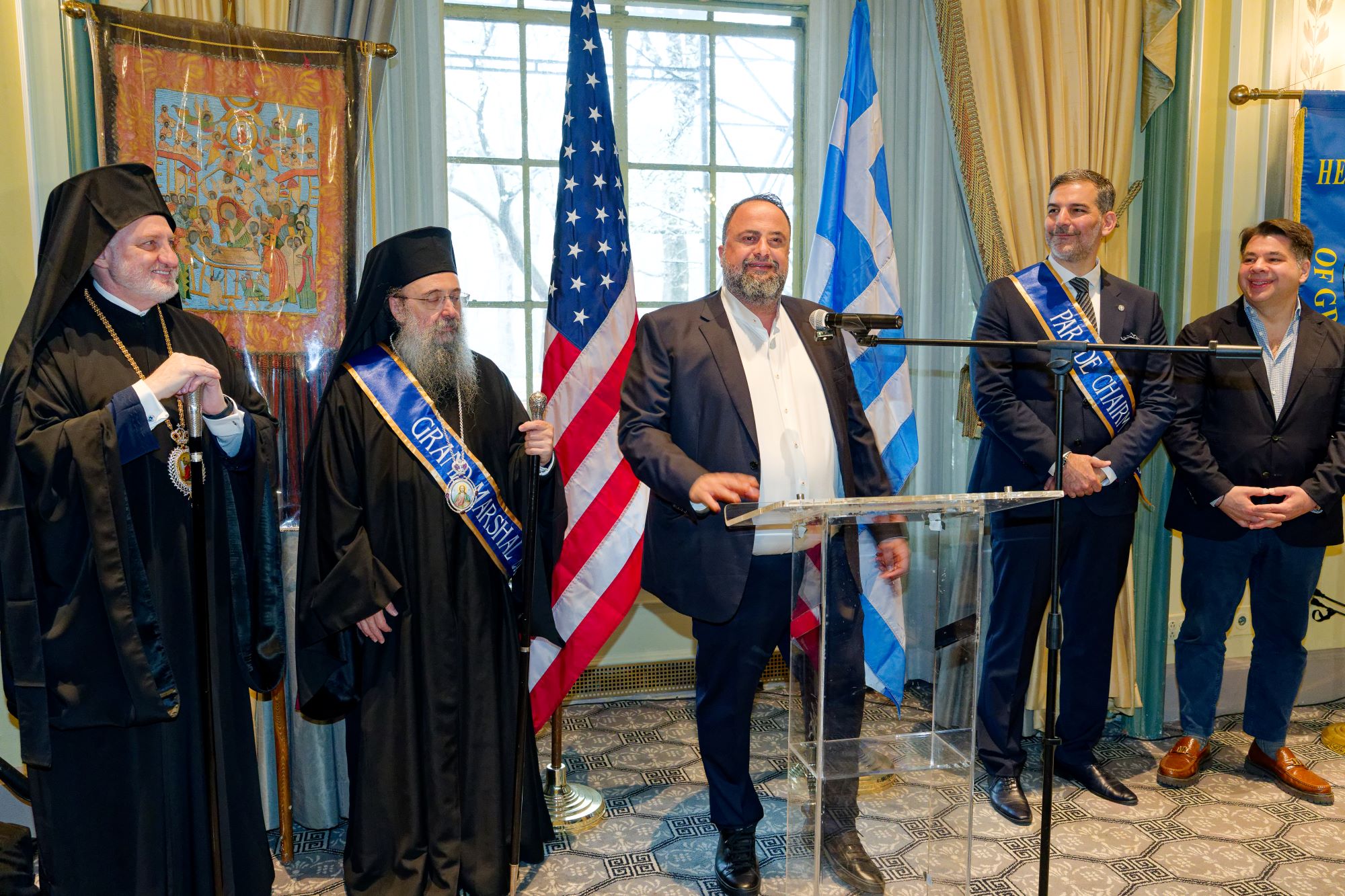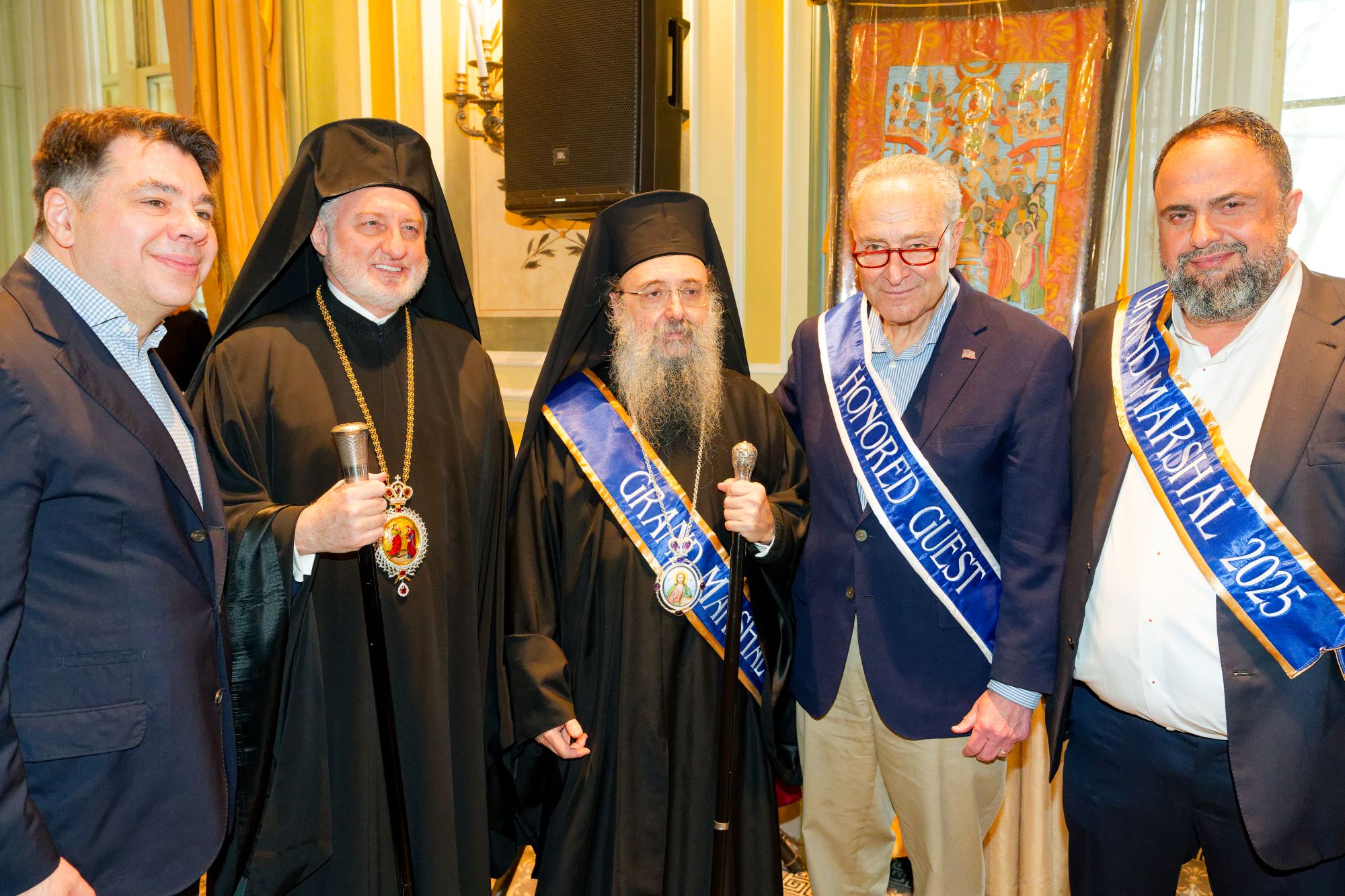 Alongside the leader of Olympiacos FC, other honored Grand Marshals included General Andrew Poppas and Metropolitan Chrysostomos of Patras. Among the distinguished guests were Archbishop Elpidophoros of America, U.S. Senate Minority Leader Chuck Schumer, and former U.S. Ambassador to Greece, Mr. George Tsounis.