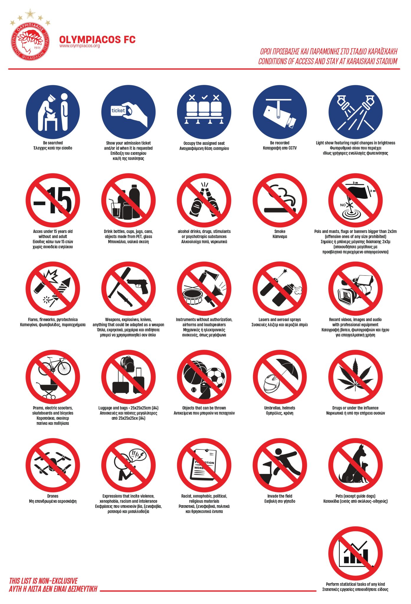 ATTENTION: Entry to the stadium is expressly subject to the spectator’s acceptance of the present Stadium Regulations, as well as the rules and regulations of FIFA, UEFA, the Hellenic Football Federation (HFF), and Super League 1 in relation to the respective competition. Entry to the stadium constitutes unconditional acceptance of the present Stadium Regulations.