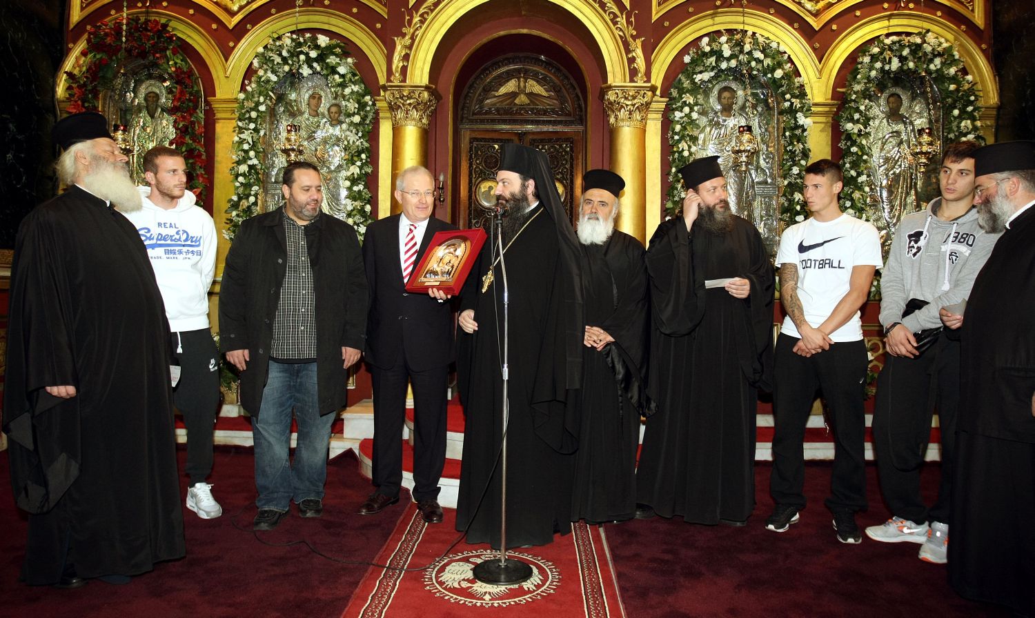 A continuación, nuestros tres futbolistas visitaron la iglesia de San Spiridon en el puerto de El Pireo. El sacerdote Yeoryios Calamaris de la Iglesia de Evanguelistrias recibió a las estrellas “blanquirrojas” así como el padre Vasilios Poppis de la iglesia de San Spiridon, el padre Nicólaos Filis de la iglesia de Fuente de la Vida, el padre Ioannis Yianisis de la iglesia de San Basilio, el padre Mavrudís Gumas de la iglesia de San Eleuterio de Caminia e hizo acto de presencia también el arquimandrita Nifon Capoyiannis, Secretario del Sacro Obispado de El Pireo.