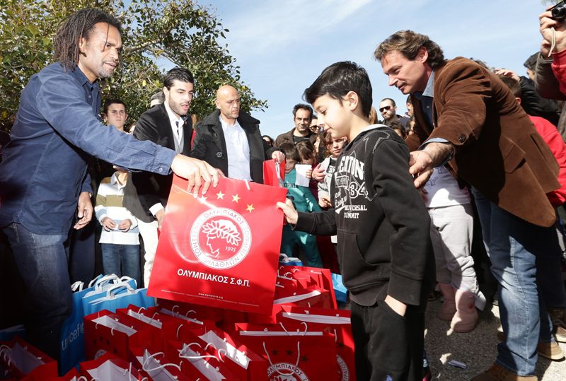 Christian Karembeu, Grigoris Yeorgatos y Miguel Torres, que recibieron el agradecimiento de las administraciones locales, repartieron regalos a los niños del 1º y 2º Colegio Público de Lixuri, brindándoles un día especial que hizo aparcar los momentos difíciles que están pasando.