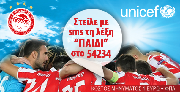 Con motivo del partido del Manchester United el martes 25/2, se ofrecerá la oportunidad de enviar un SMS desde el lunes 24/2 a las 09:00 hasta el miércoles 26/2 a las 22:00, a fin de contribuir a esta causa común del OLYMPIACOS y de UNICEF.