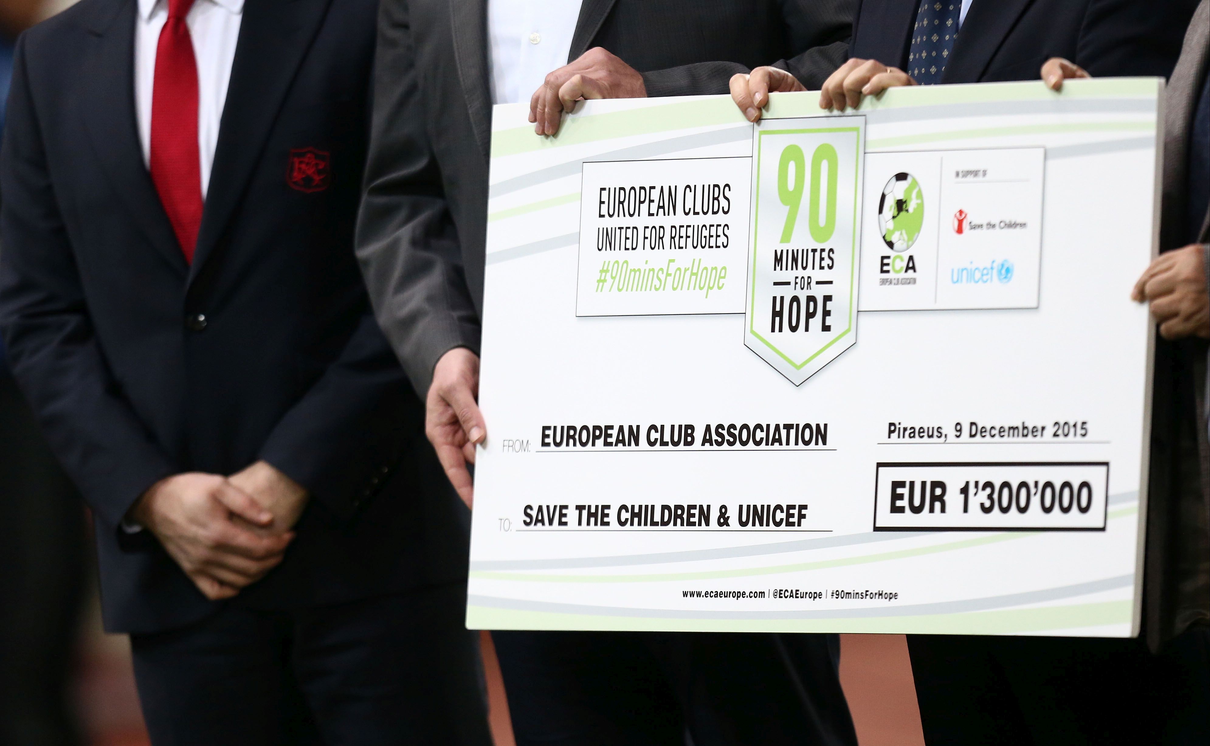 Un poco antes del comienzo del encuentro, la ACE (Asociación de Clubes Europeos) presentó un cheque por valor de 1,3 millones de euros, que hizo entrega para ayudar a los niños de los refugiados en toda Europa. El dinero se reunió mediante la recaudación de un euro por cada entrada en cada primer partido en casa de cada club durante la presente competición, tanto en los encuentros de la UEFA Champions League como los de la UEFA Europa League. La cantidad está destinada a “Save the children” y a Unicef para ayudar económicamente y contribuir así a hacer frente a la crisis de los refugiados en el Viejo Continente.