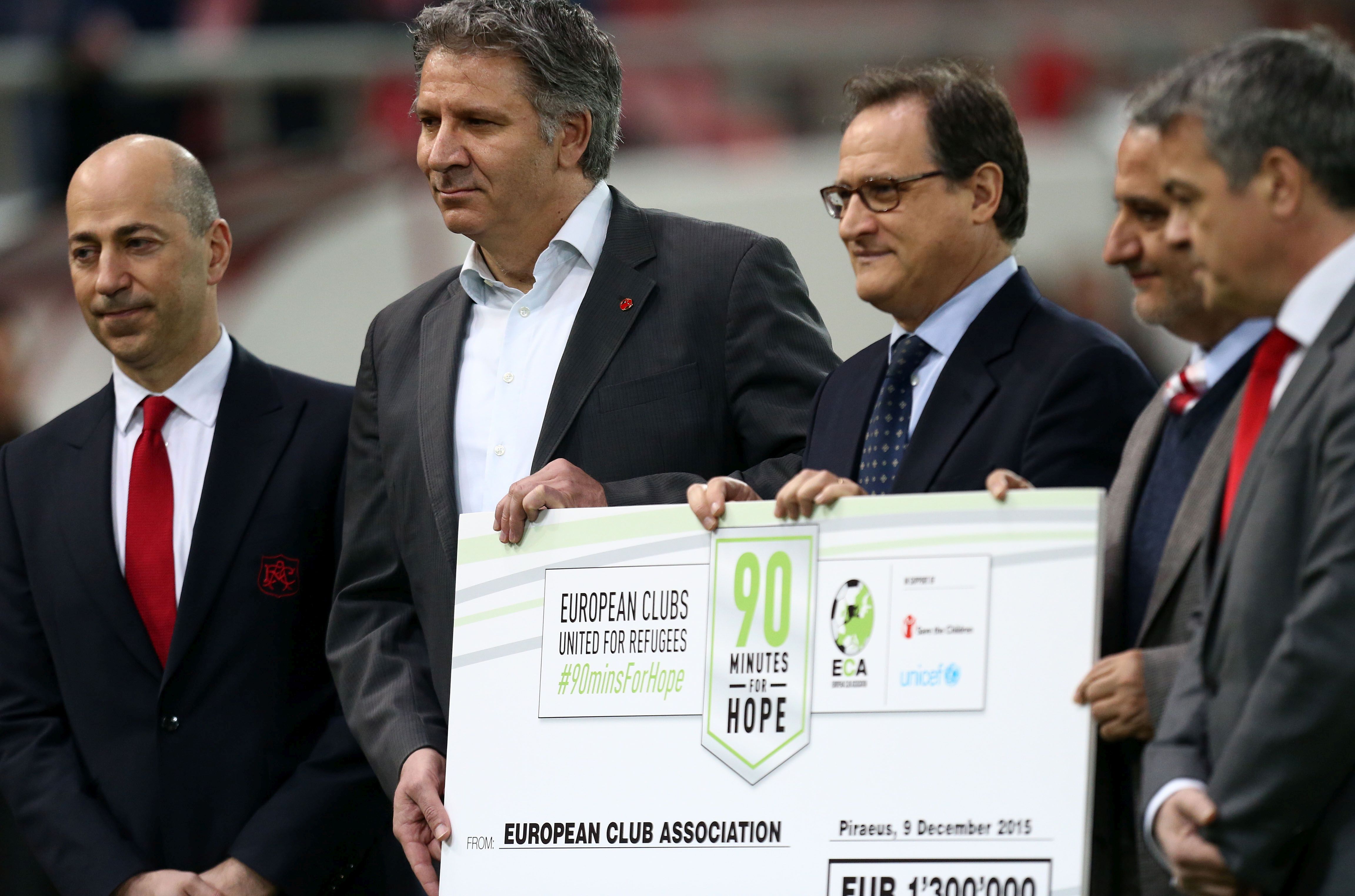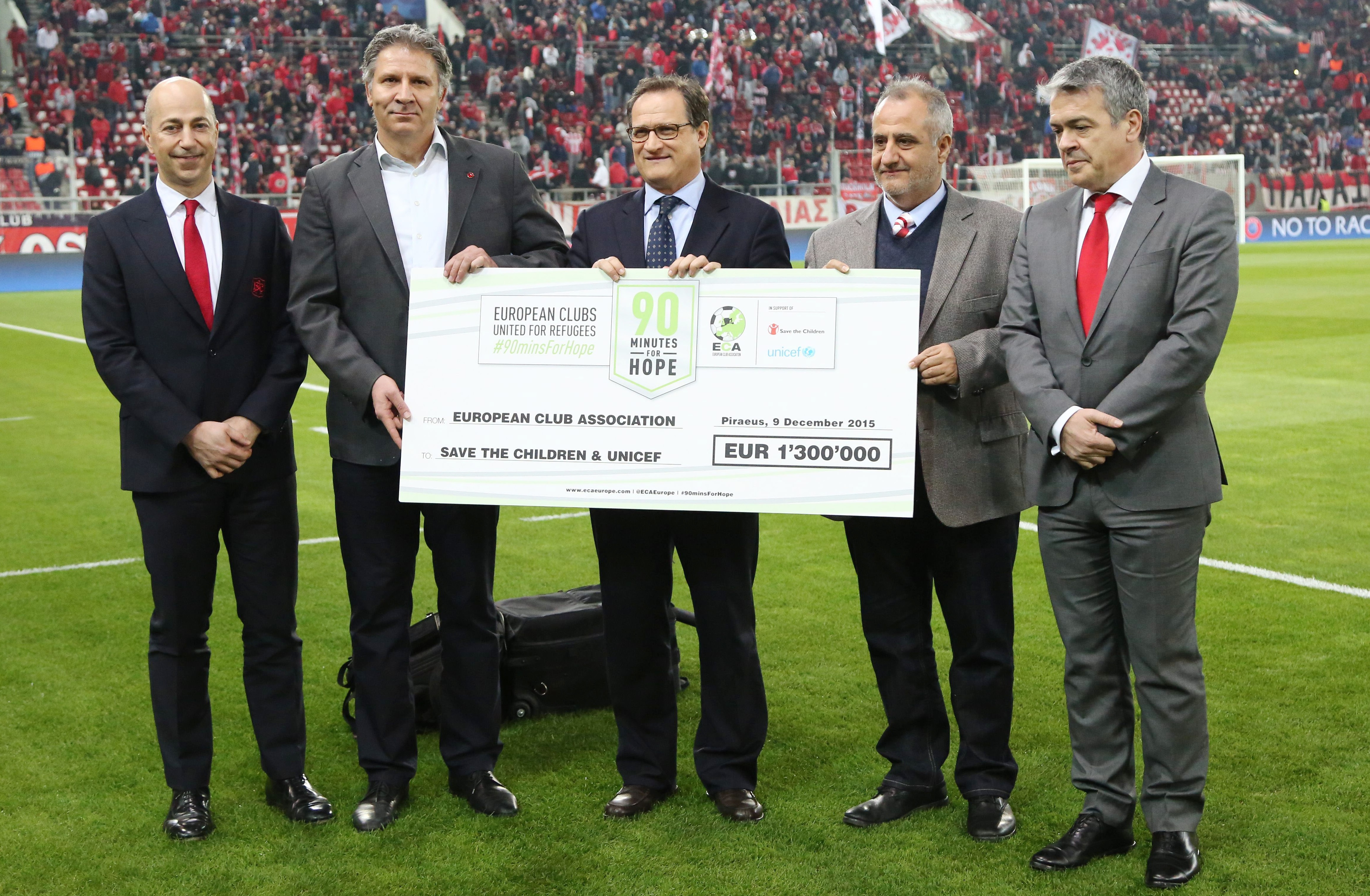 La ACE, compuesta por 220 miembros entre los cuales se encuentra el Olympiacós además del Arsenal, tuvo la iniciativa como parte de la campaña “90 minutos para la esperanza” que comenzó en setiembre. Más de 870.000 refugiados han llegado a Europa en 2015 y el 20% de ellos son niños. La entrega del cheque tuvo lugar en el “G. Karaiskakis” antes del saque de honor entre autoridades del Olympiacós, del Arsenal, de “Save the children” y de Unicef.