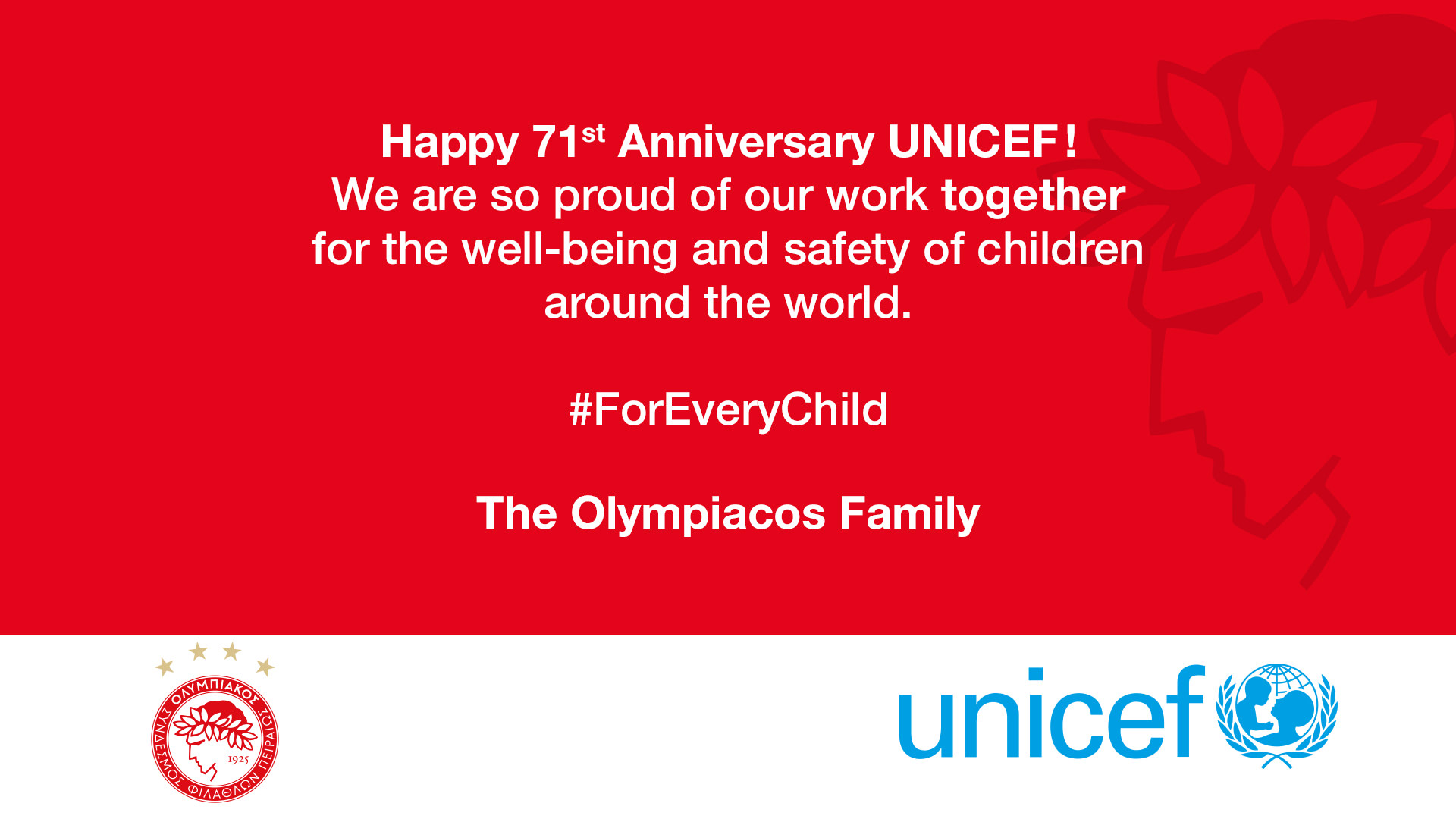 Cuando los niños necesitan protección de cara a afrontar enfermedades, conflictos o marginación social, Unicef está allí, y nosotros, la familia del Olympiacós estamos orgullosos de estar desde 2013 a su lado, a fin de ayudar a cuantos más niños necesitados sea posible, tanto en Grecia como en el resto del mundo.