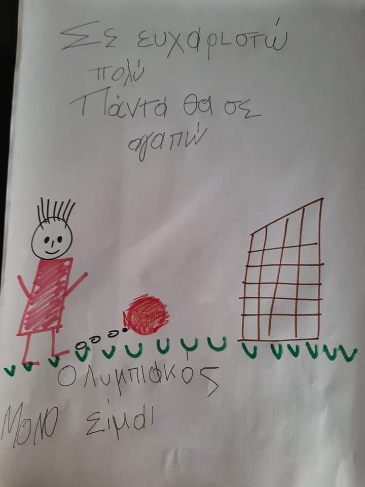Y un ejemplo de ello es el caso de un pequeño amigo del equipo que estudia en un colegio lejos de la cuenca del Ática y cómo un sencillo gesto puede hacer que un niño pequeño llore de alegría, sintiendo la necesidad de olvidarse un poco de la rutina diaria y el Olympiacós aportó su sentimiento en ello. Todo comenzó cuando una maestra del colegio referido, envió el siguiente mensaje: