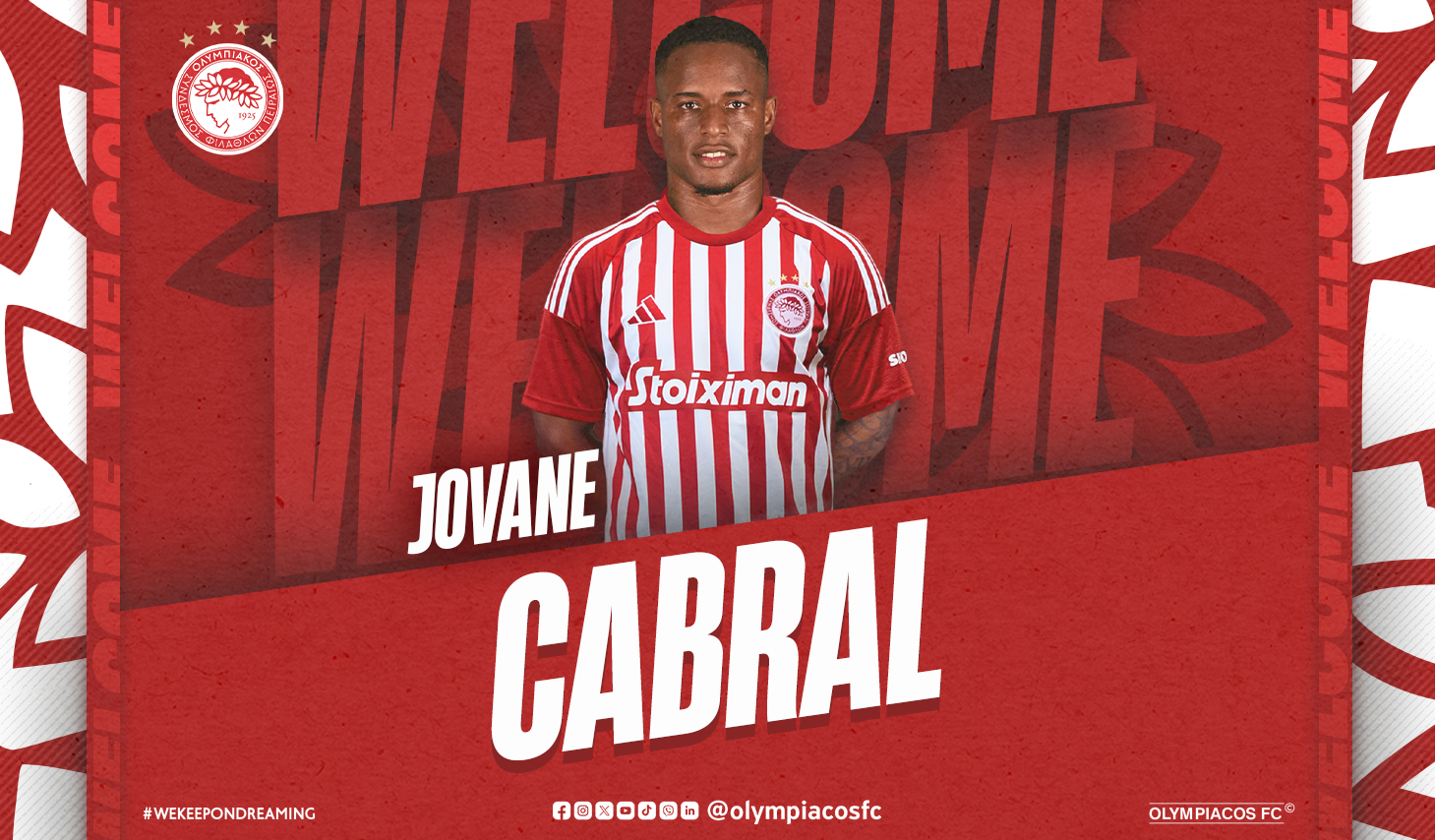 El Olympiacós FC anuncia el fichaje de Jovane Eduardo Borges Cabral. El extremo de 25 años nació el 14 de junio de 1998 en Cabo Verde y a la edad de 16 años se incorporó a la cantera del Sporting procedente del Grémio Nhagar de su país. Tras jugar en los equipos Sub17, Sub19 y en el segundo equipo del Sporting, debutó con el primer equipo en octubre de 2017.
