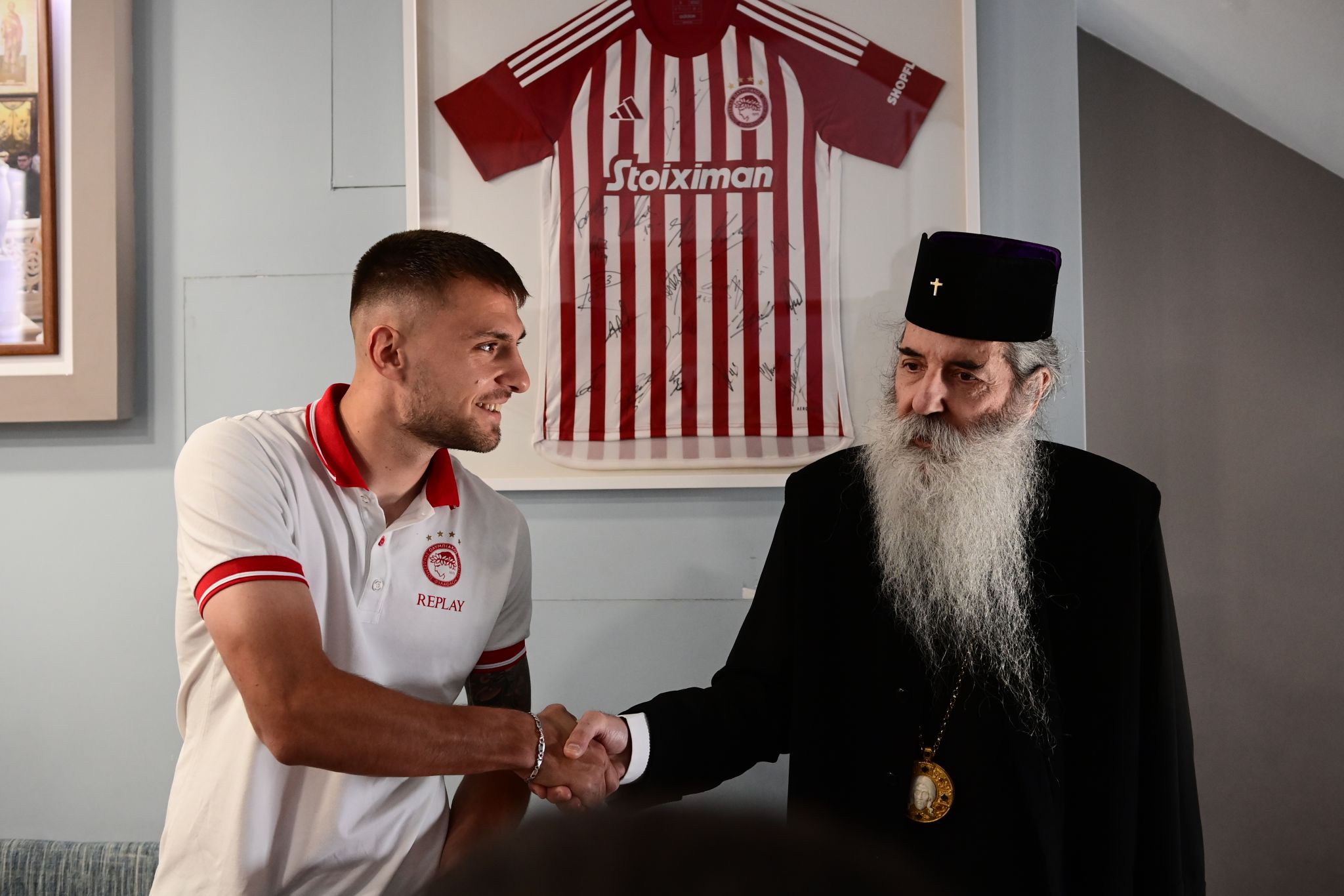 Junto al futbolista del equipo Andreas Doi, que recibió las felicitaciones de todos por la clasificación del Olympiacos para las semifinales de la Liga Europa Conferencia de la UEFA, también estaba el obispo de El Pireo, Serafín, que en sus declaraciones subrayó:
